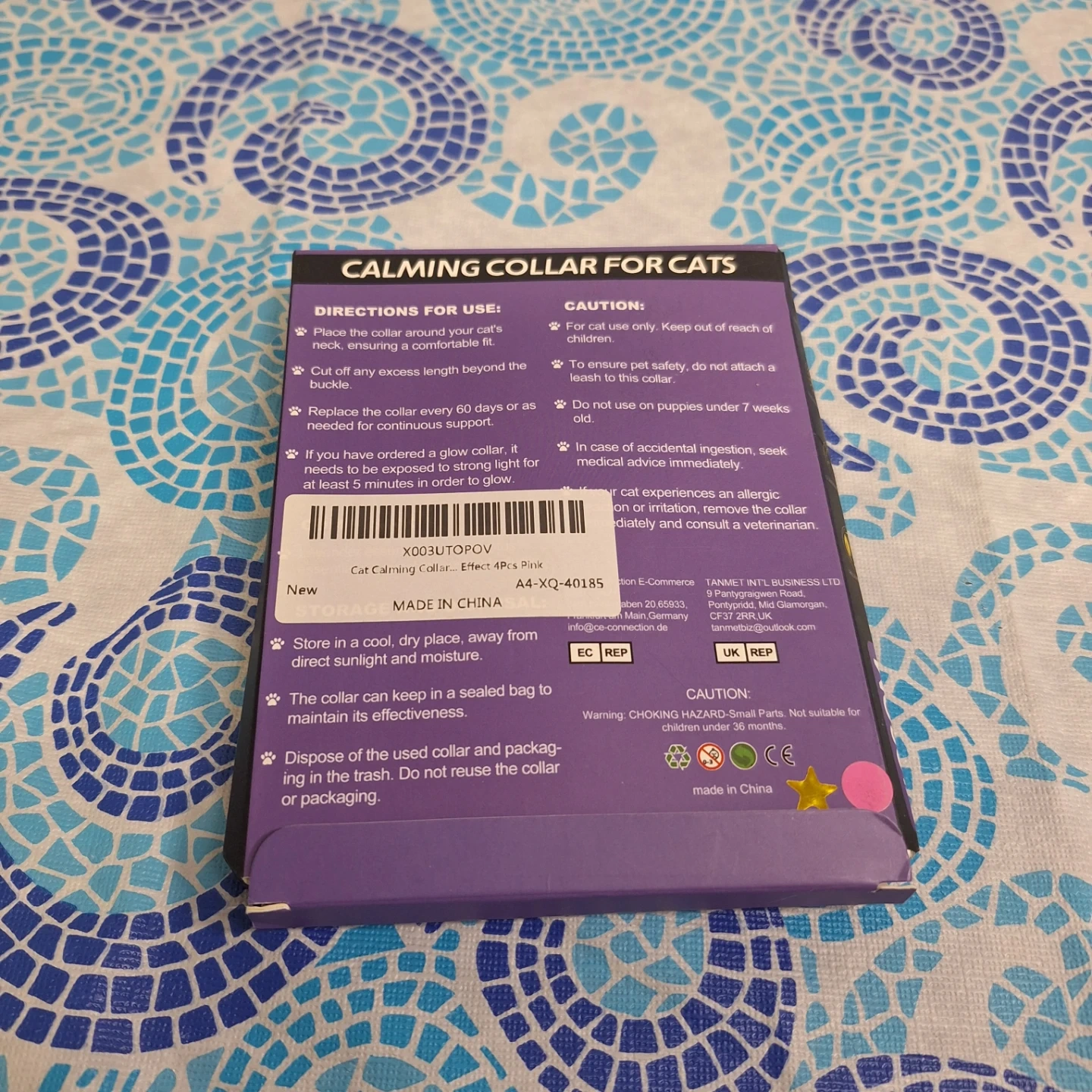 Calming collar for cats, 4 packs included. Soothes stress and anxiety. Effective within 1 hour. Collar length is 48cm/18.9 inches.