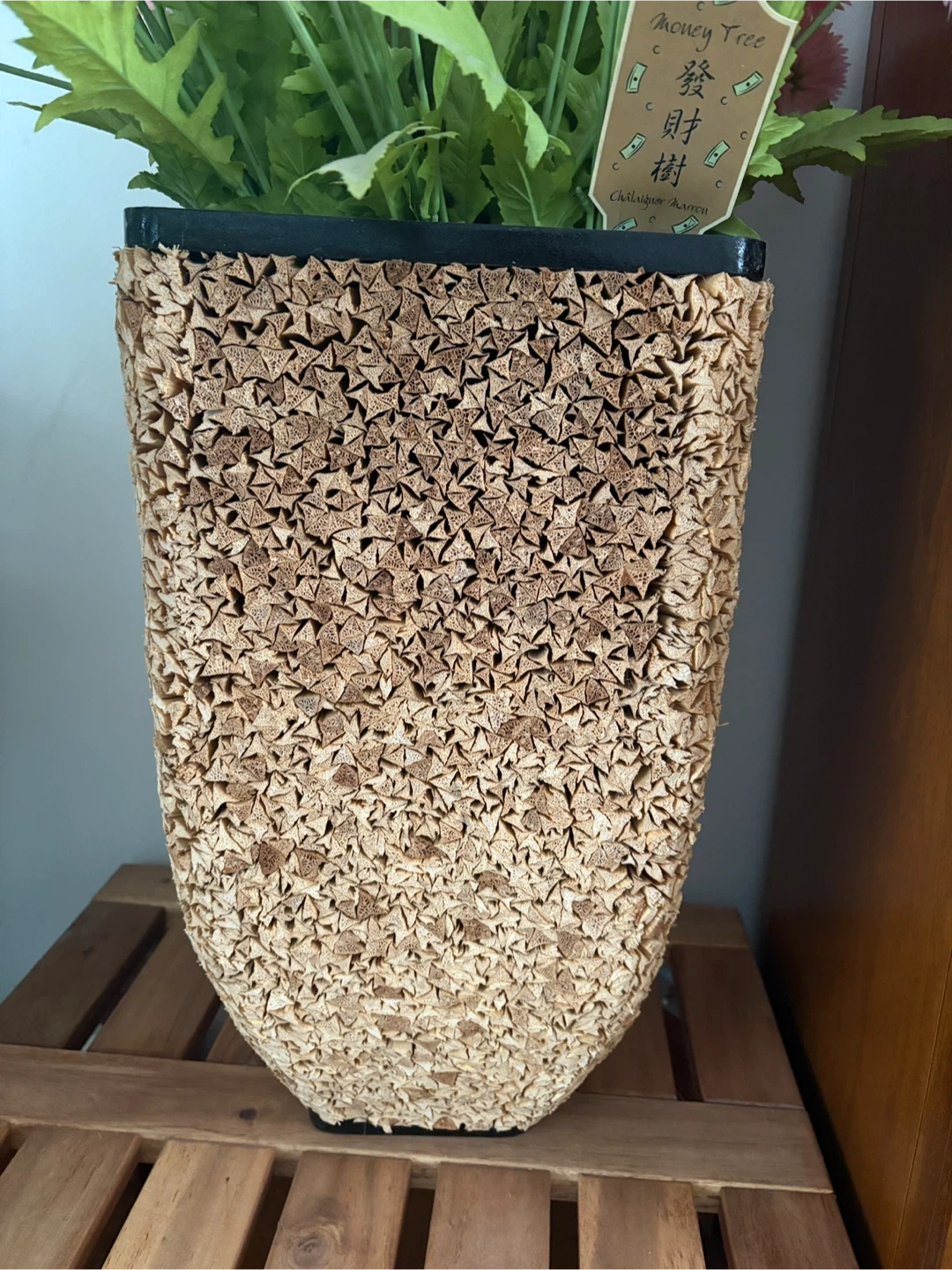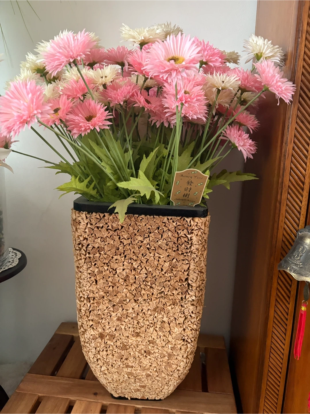 This decorative vase features a unique, textured design with a natural, woven appearance. It's filled with a vibrant bouquet of artificial pink and white daisies, complete with greenery. The arrangement sits atop a wooden stand, adding a charming touch to any room. A small tag attached to the flowers reads "Money Tree" in both English and Chinese, suggesting a symbolic meaning.
