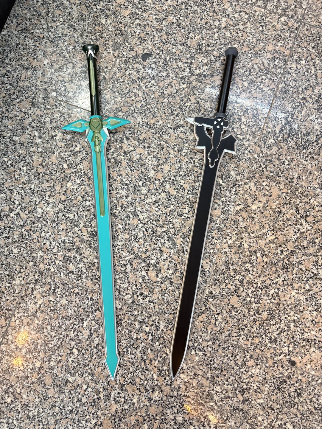 Two replica swords, one black Elucidator and one teal Dark Repulser. These are for display or cosplay purposes. They're lightweight and have a detailed design.
