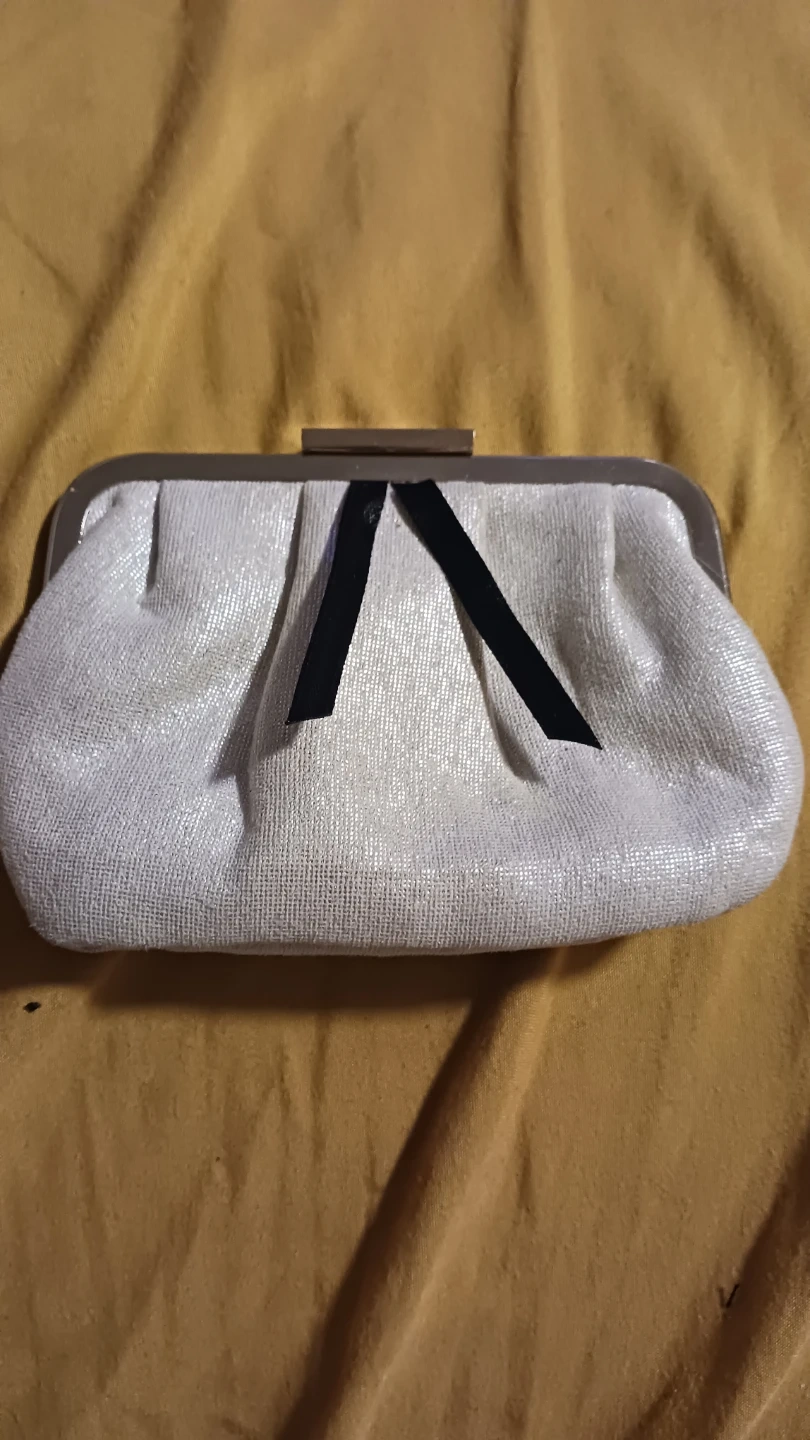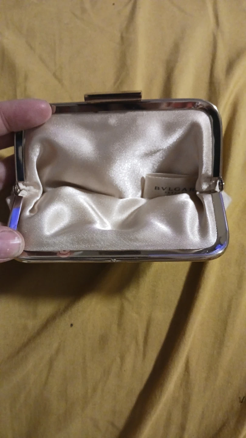 This is a Bvlgari Parfum clutch bag. It's ivory with a textured inlayed silk exterior and satin lining. Features a gold-tone clasp and a decorative black ribbon detail. Perfect for holding essentials.