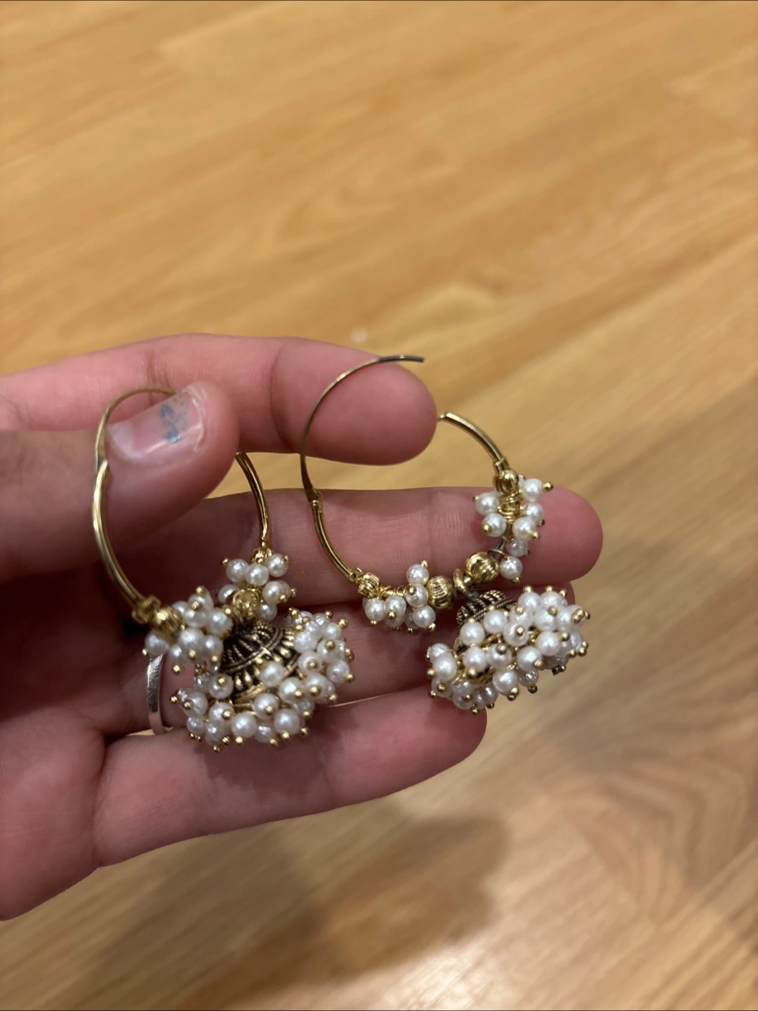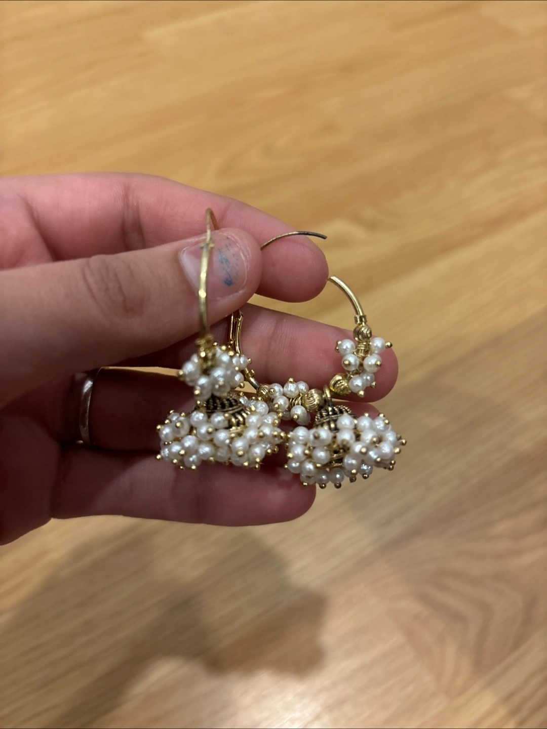 Selling a pair of beautiful pearl jhumka earrings. They have a gold tone and are in great condition. Perfect for adding a touch of elegance to any outfit