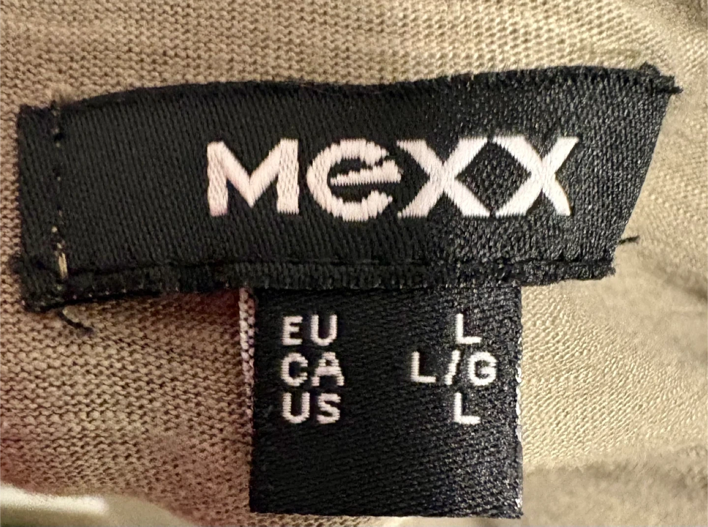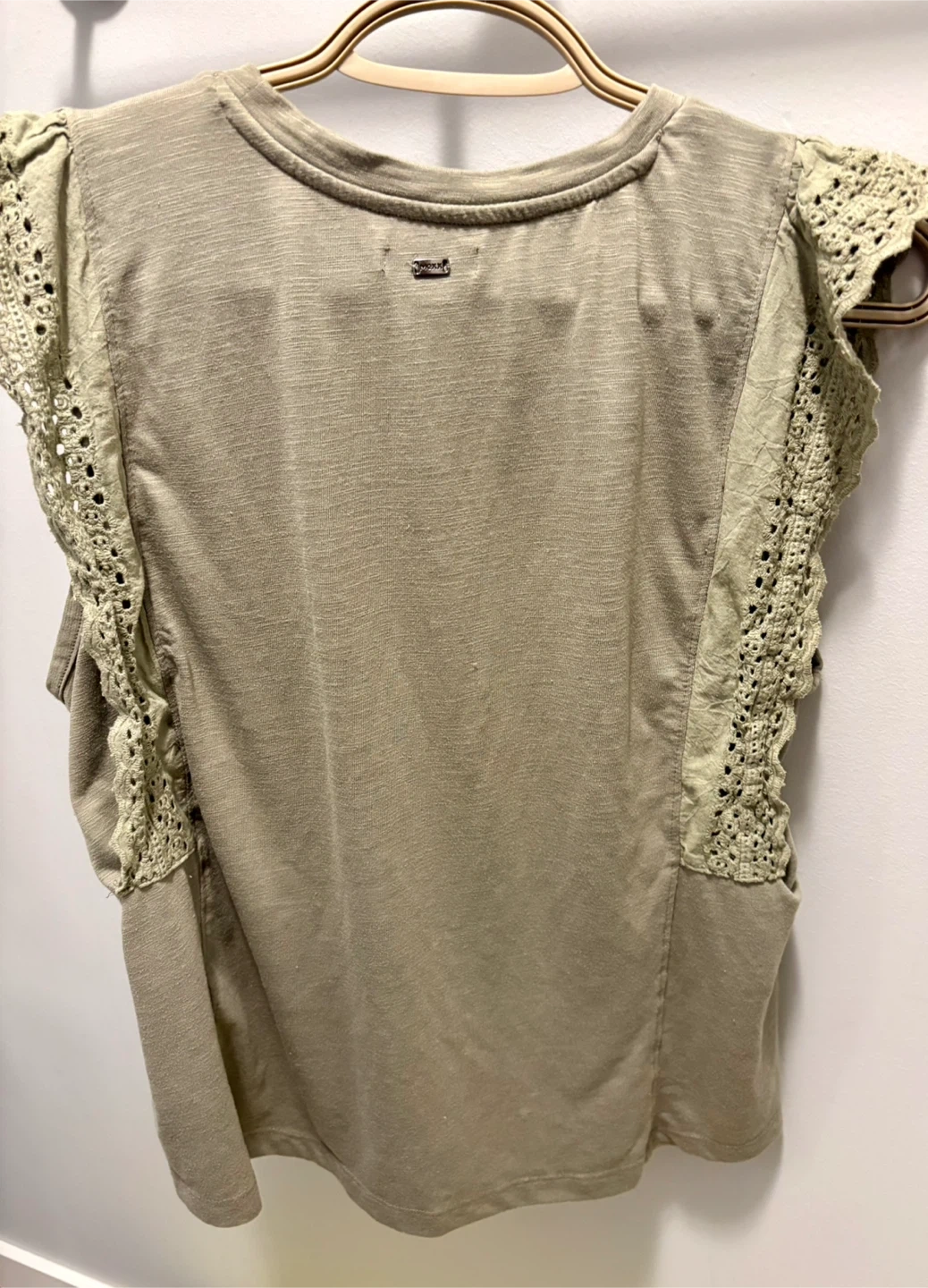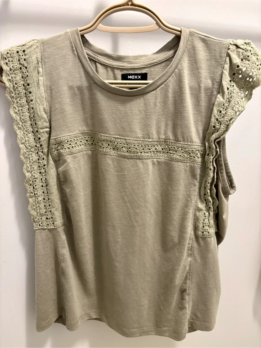 This MEXX Olive green sleeveless top is size Large. This shirt has intricate lace detailing along the shoulders and a horizontal lace insert across the chest. Material is a soft knit fabric with a small metal brand tag on the back neck.