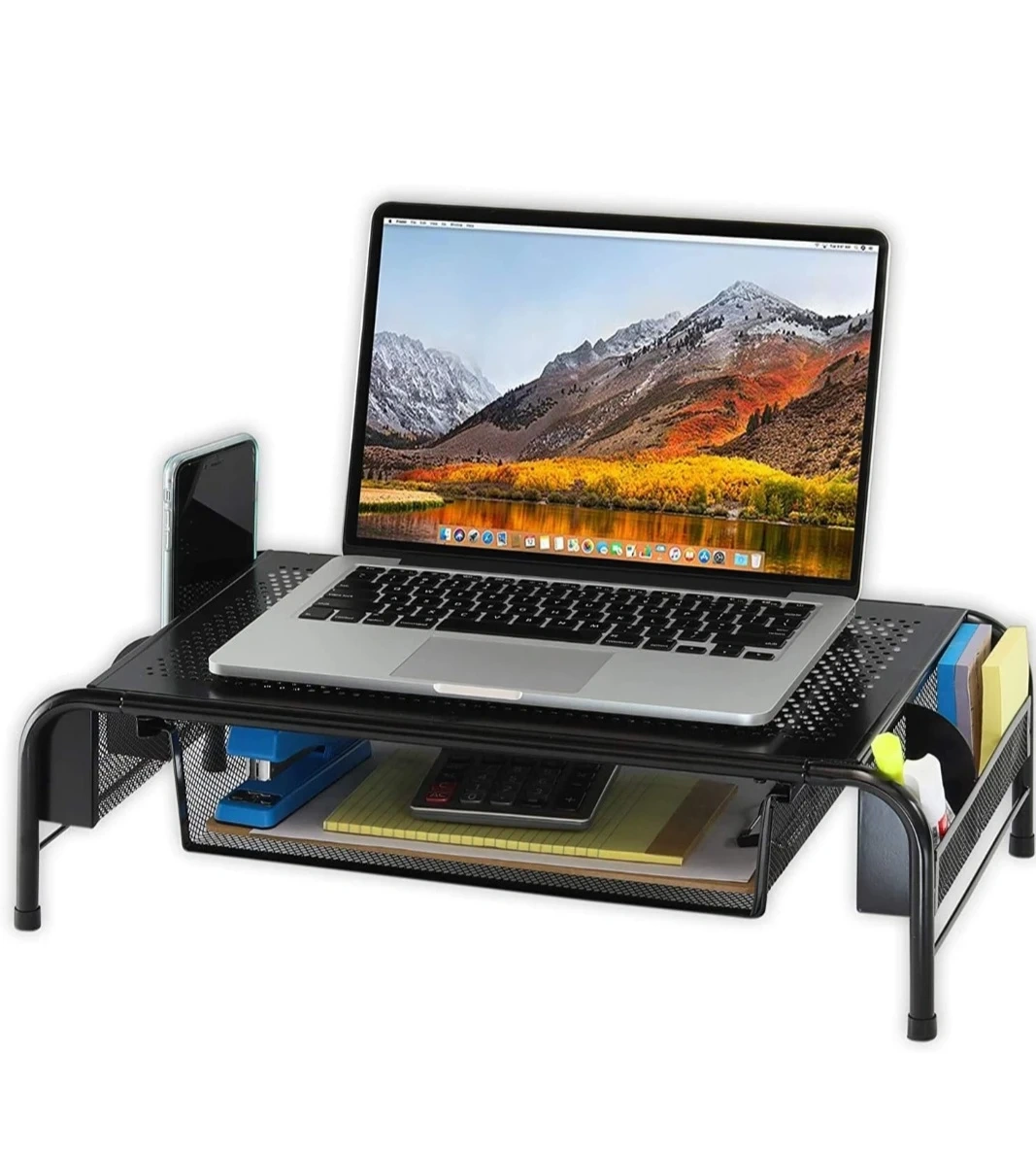 This black mesh monitor stand elevates your monitor and organizes your desk. It features a sliding drawer and side compartments for pens and other supplies. Metal mesh construction.