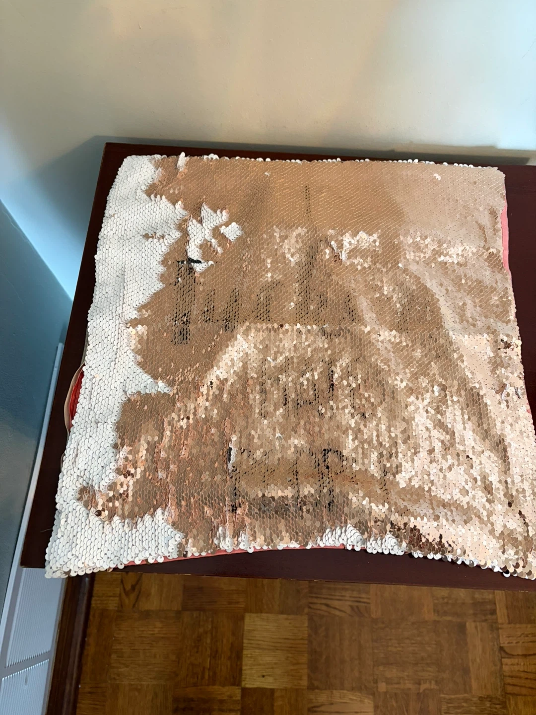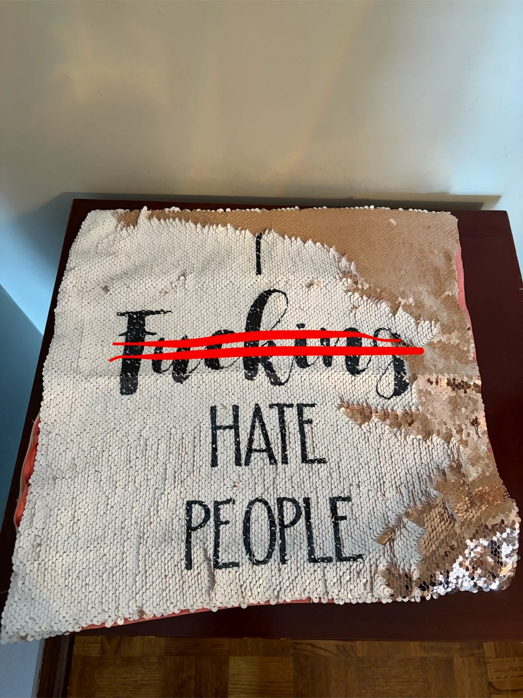 Double-sided pillow cover with reversible sequins. One side shows "I F*cking Hate People" with the middle word crossed out, and the other side is blank white sequins. It's a fun way to express your mood!