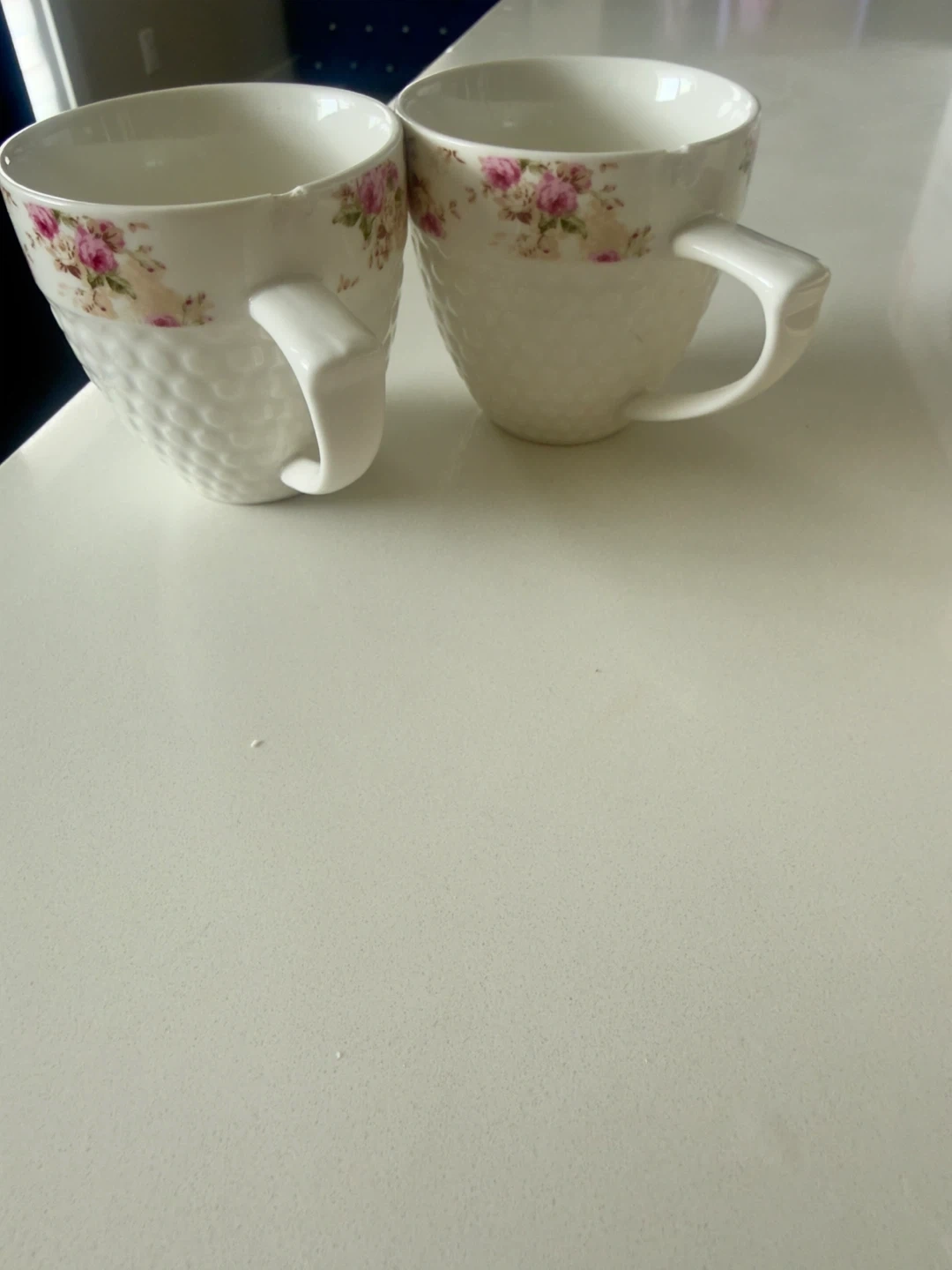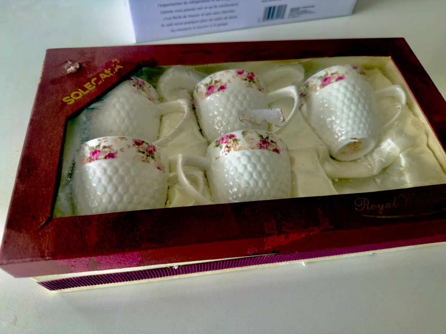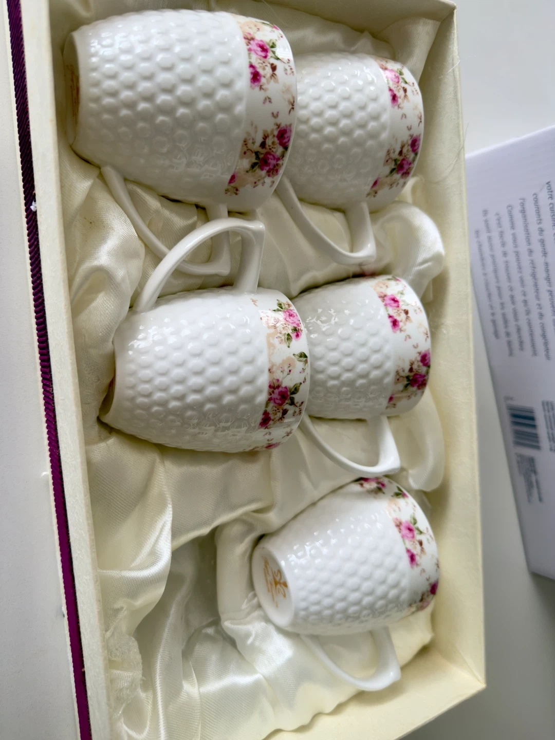Set of 5 porcelain teacups with a floral design. Each cup has a textured white exterior and a decorative floral band near the rim. Comes in original box with satin lining.