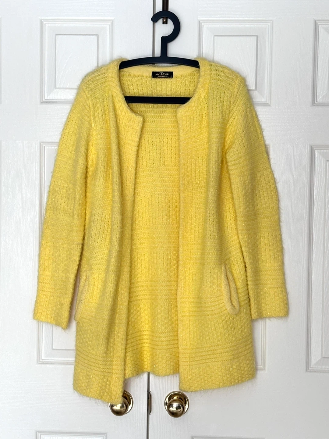 A cozy yellow cardigan from The Rose. It's a lovely pastel yellow colour with a textured knit. It features two front pockets and a relaxed fit. It's perfect for layering on cooler days!