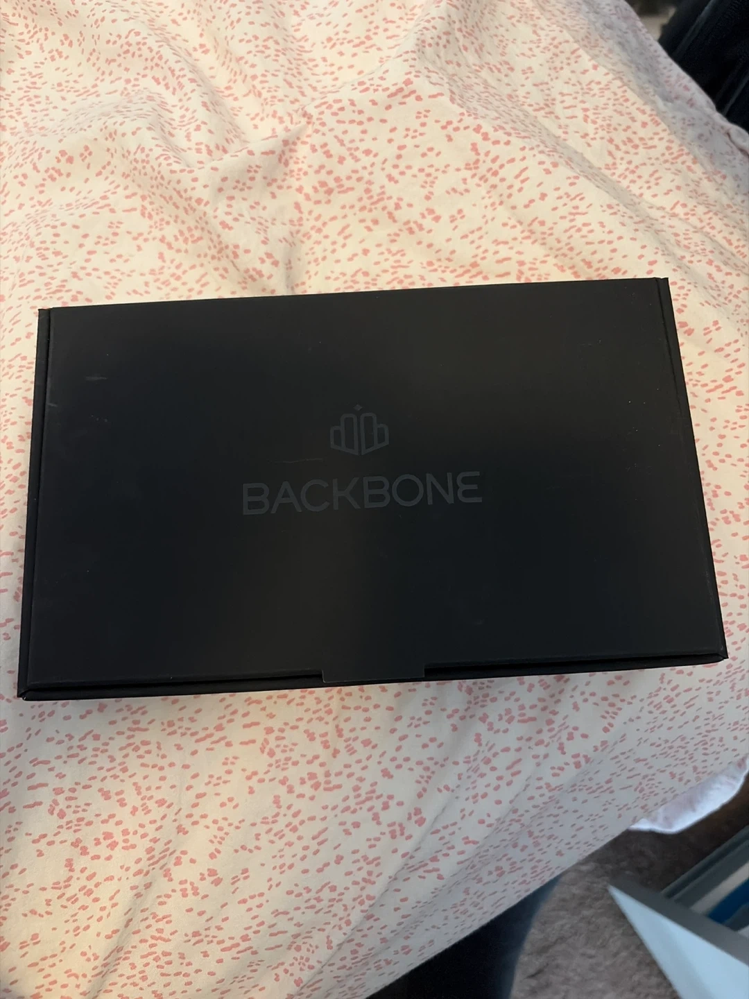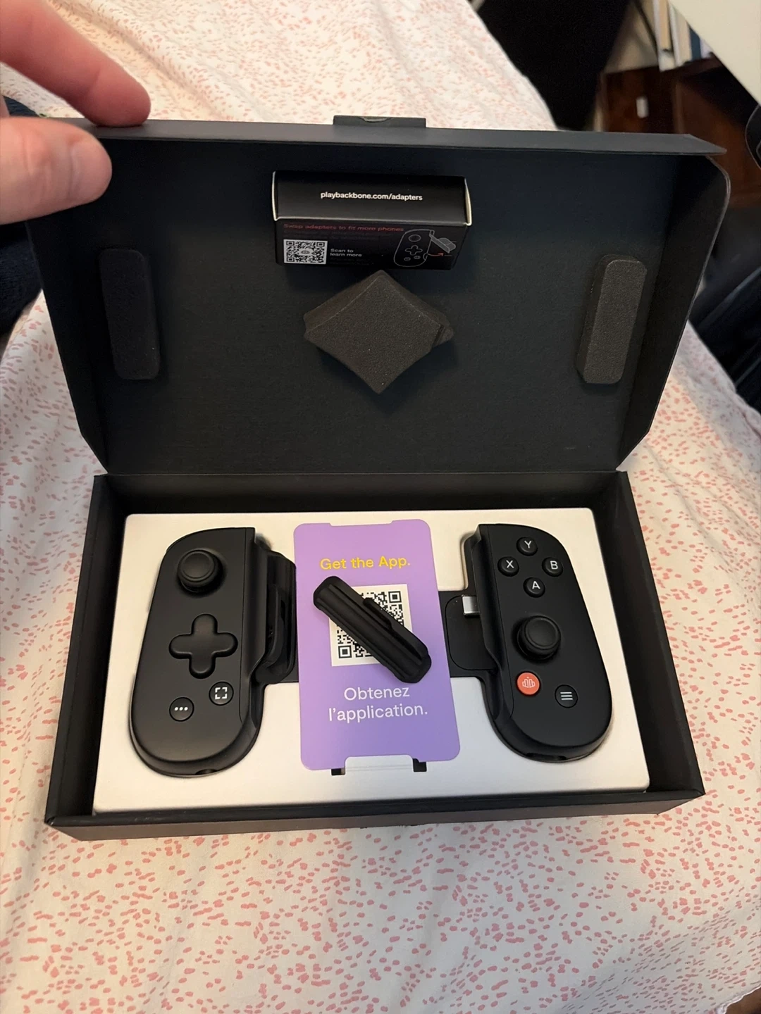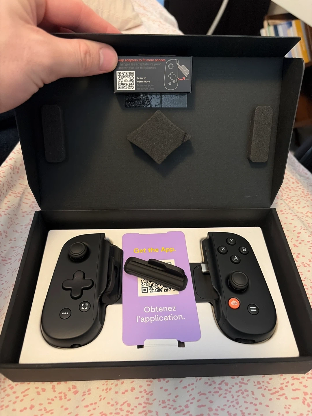 This is a Backbone One controller for iPhone. It comes with the controller itself and a small adapter. It's designed to enhance your mobile gaming experience.