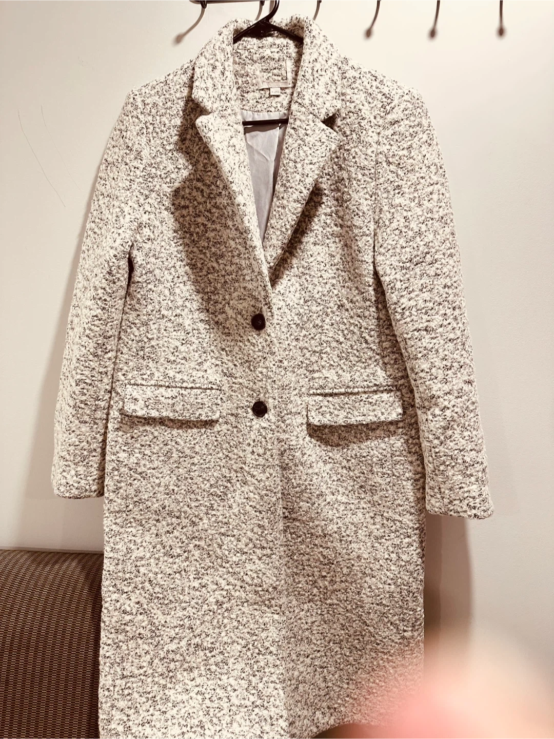 This women's tweed coat features a speckled pattern with black and white threads. It has a classic collar, button closure, and two front pockets. The interior lining is a smooth grey fabric. Perfect for cooler weather!
