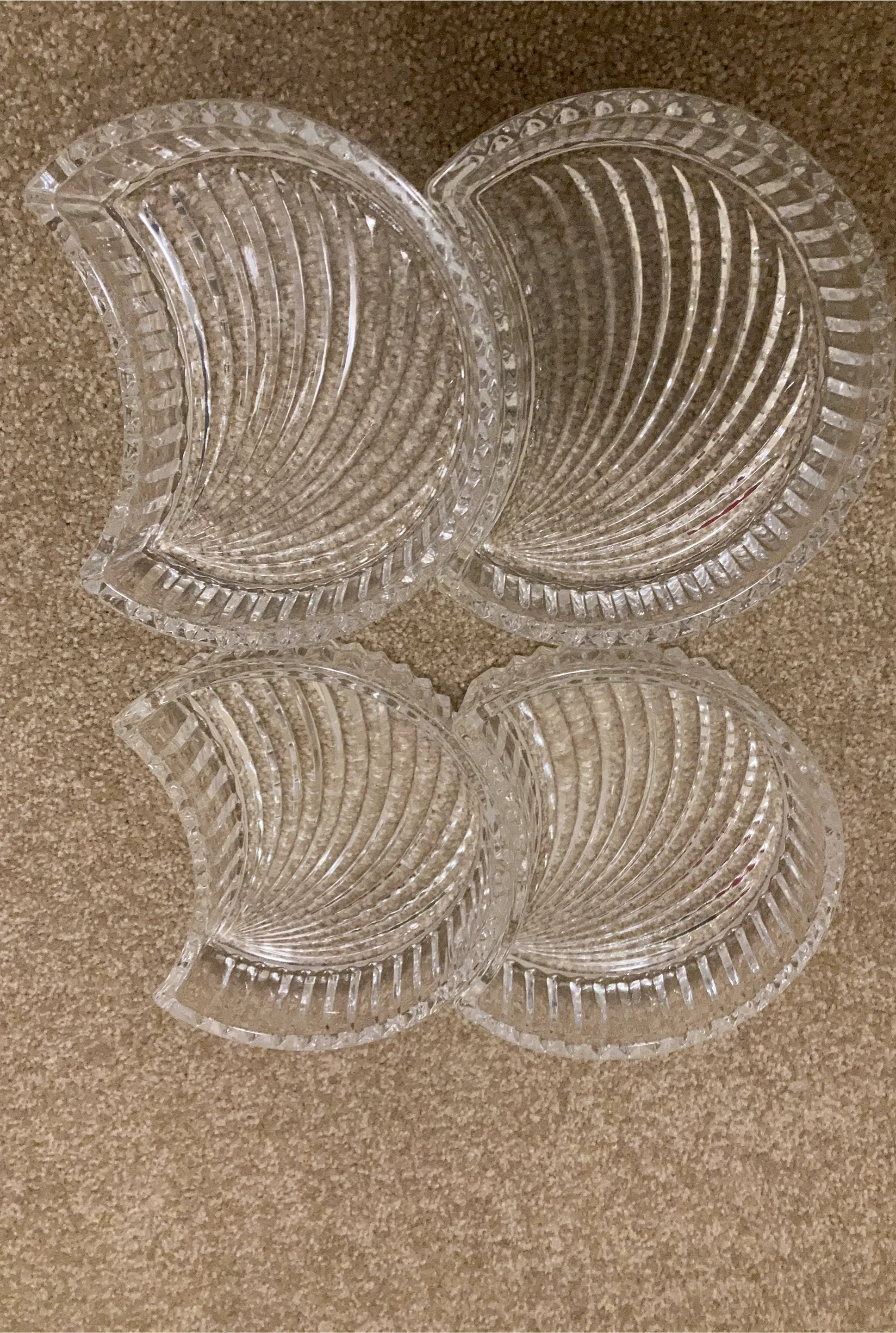 This is a set of four crystal glass dessert bowls. They feature a ribbed design and a scalloped edge. Great for serving appetizers, desserts or snacks!