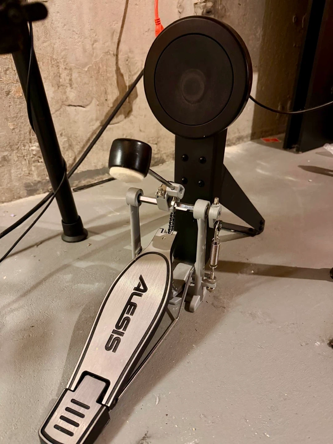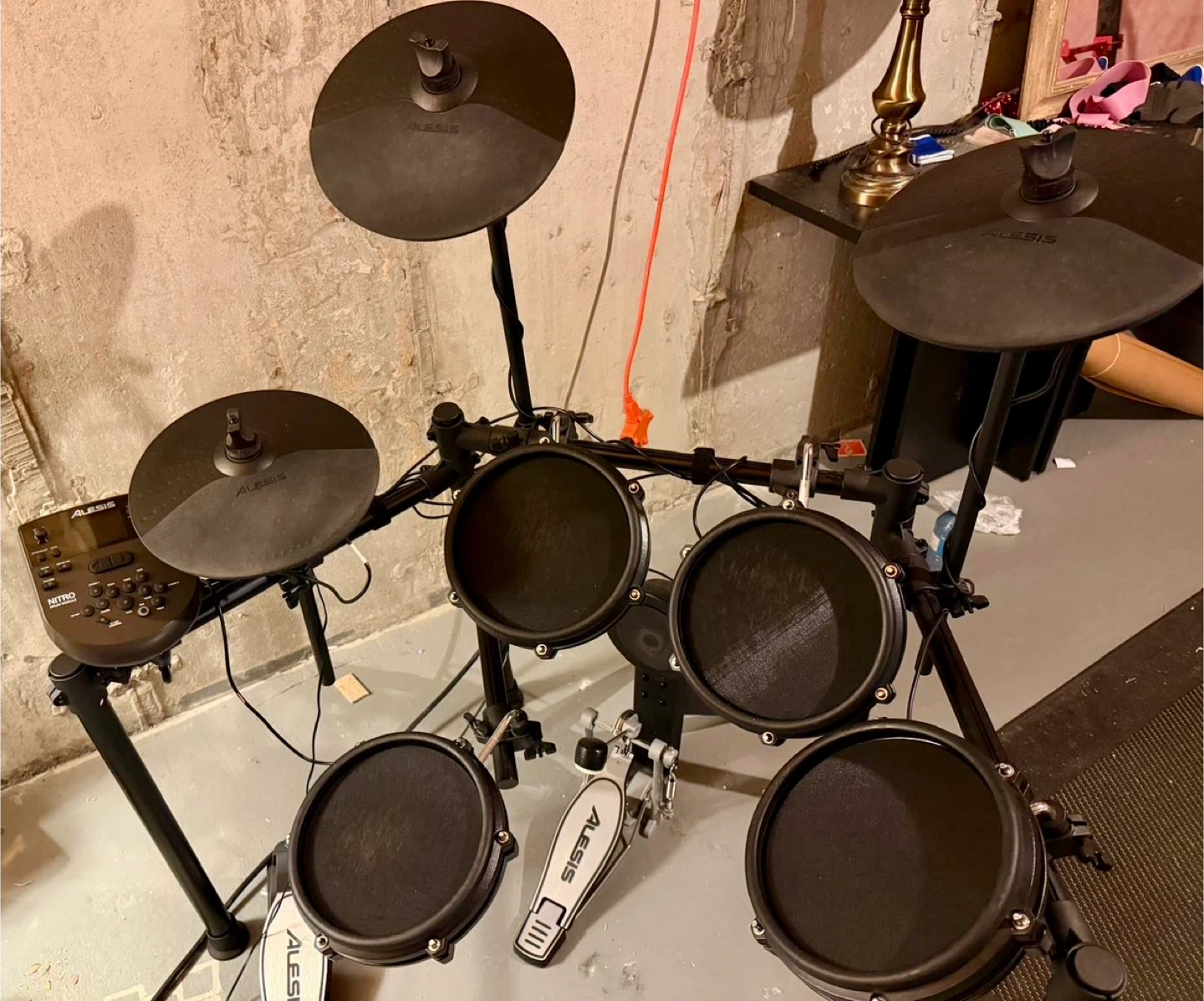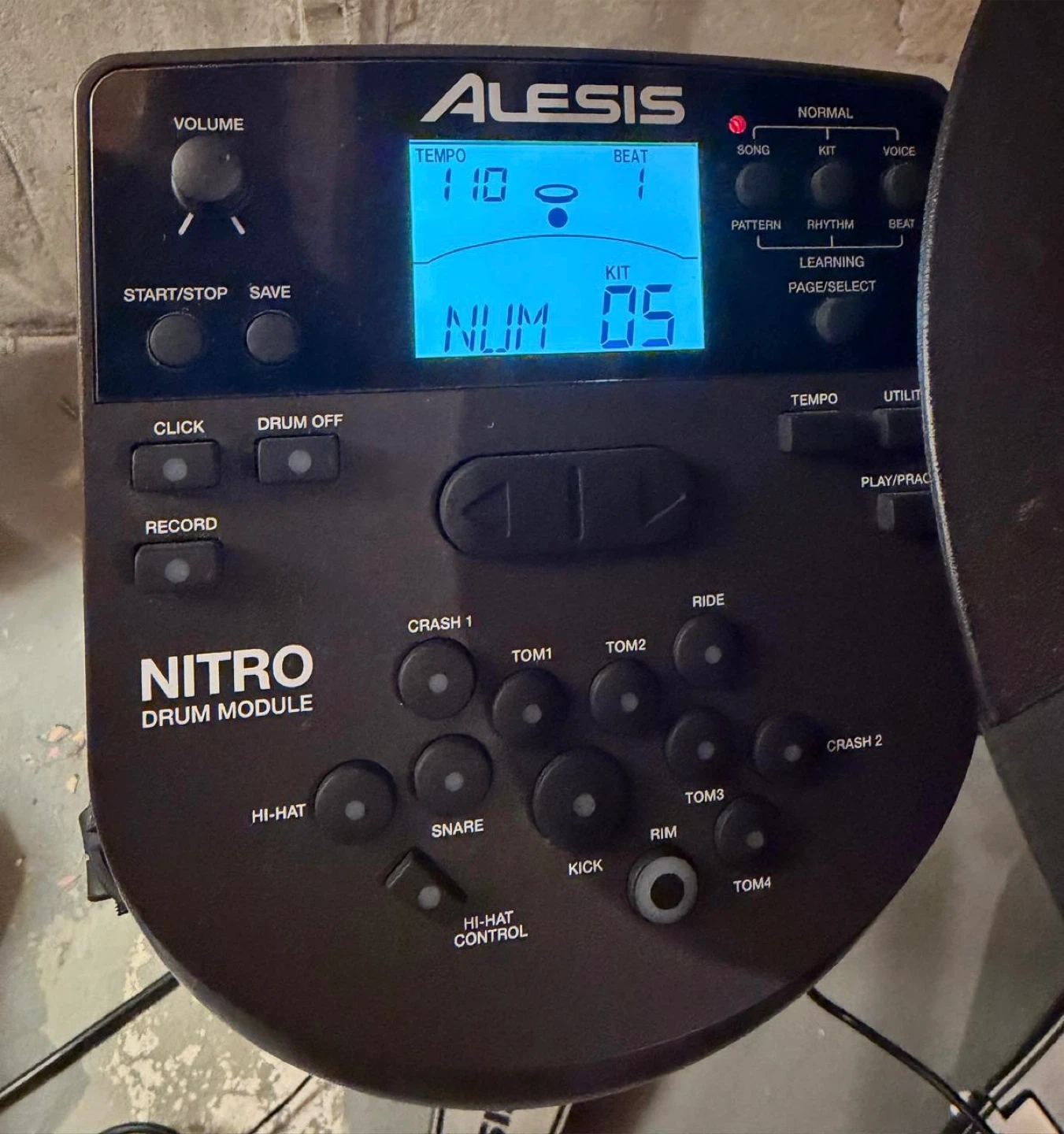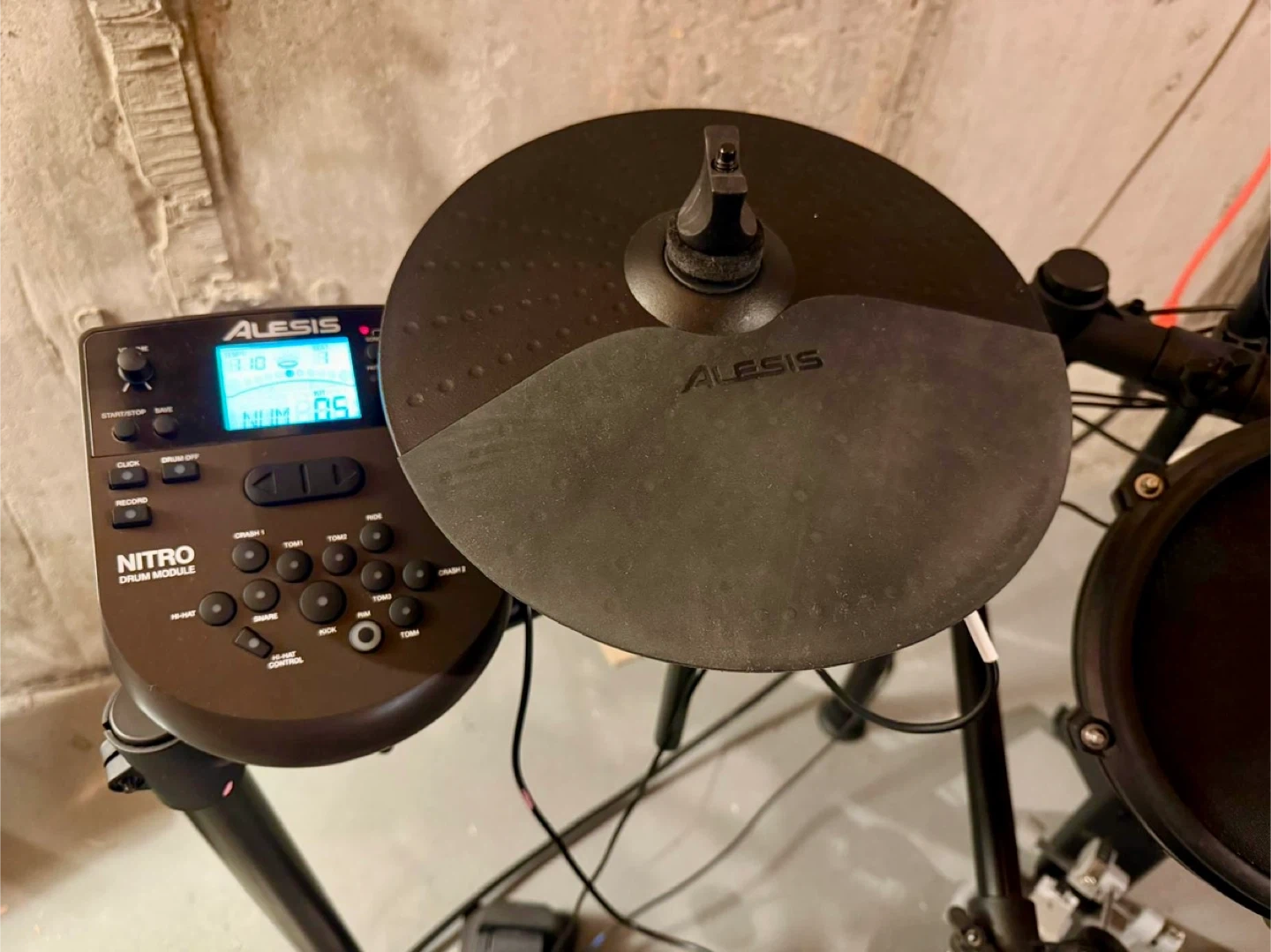This is an Alesis Nitro electronic drum module and kit for sale in mint condition. It includes the drum module, kick pedal, hi-hat pedal, drum pads, and cymbals. Perfect for practice or performance.