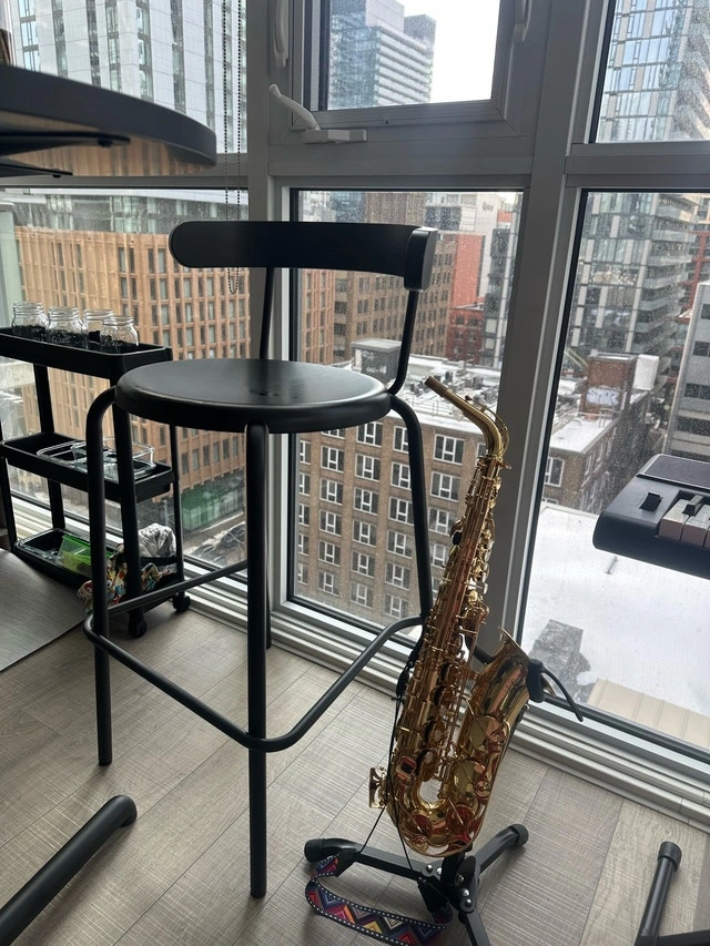 This set includes a high black table and two black chairs with backrests, perfect for a modern and minimalist space. The set is in used condition but has been well-maintained.