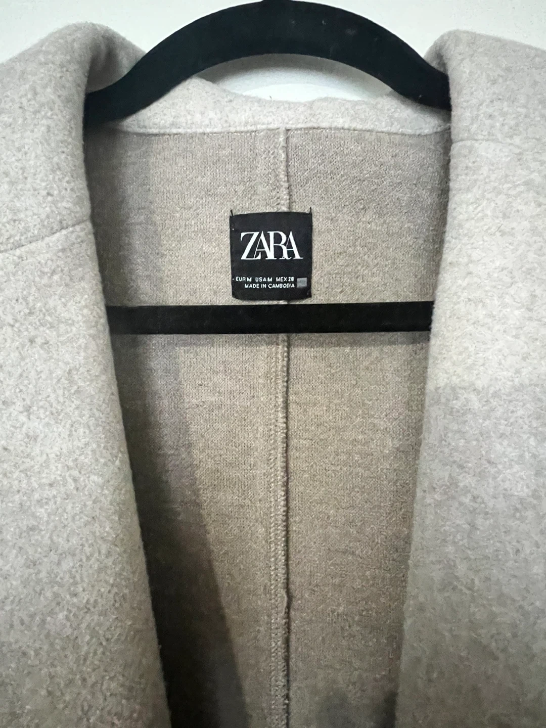 Two ZARA long coats are available, one in grey and one in a light beige. They're made in Myanmar and feature a classic lapel design. Size M.