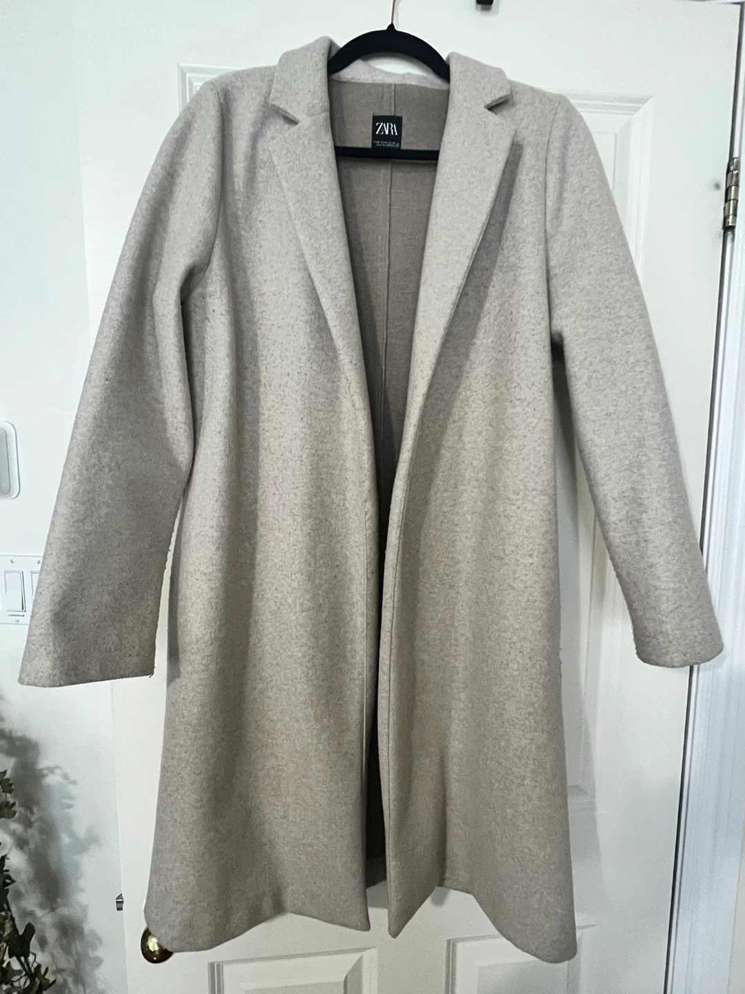 Two ZARA long coats are available, one in grey and one in a light beige. They're made in Myanmar and feature a classic lapel design. Size M.