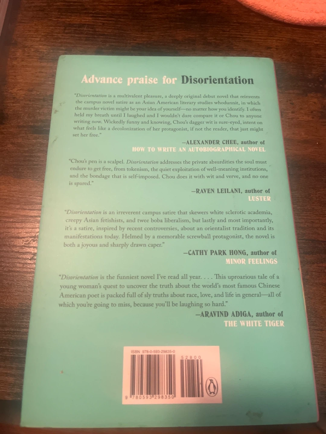This is "Disorientation: A Novel" by Elaine Hsieh Chou. It's a satirical look at campus life and cultural identity. It's a paperback edition.