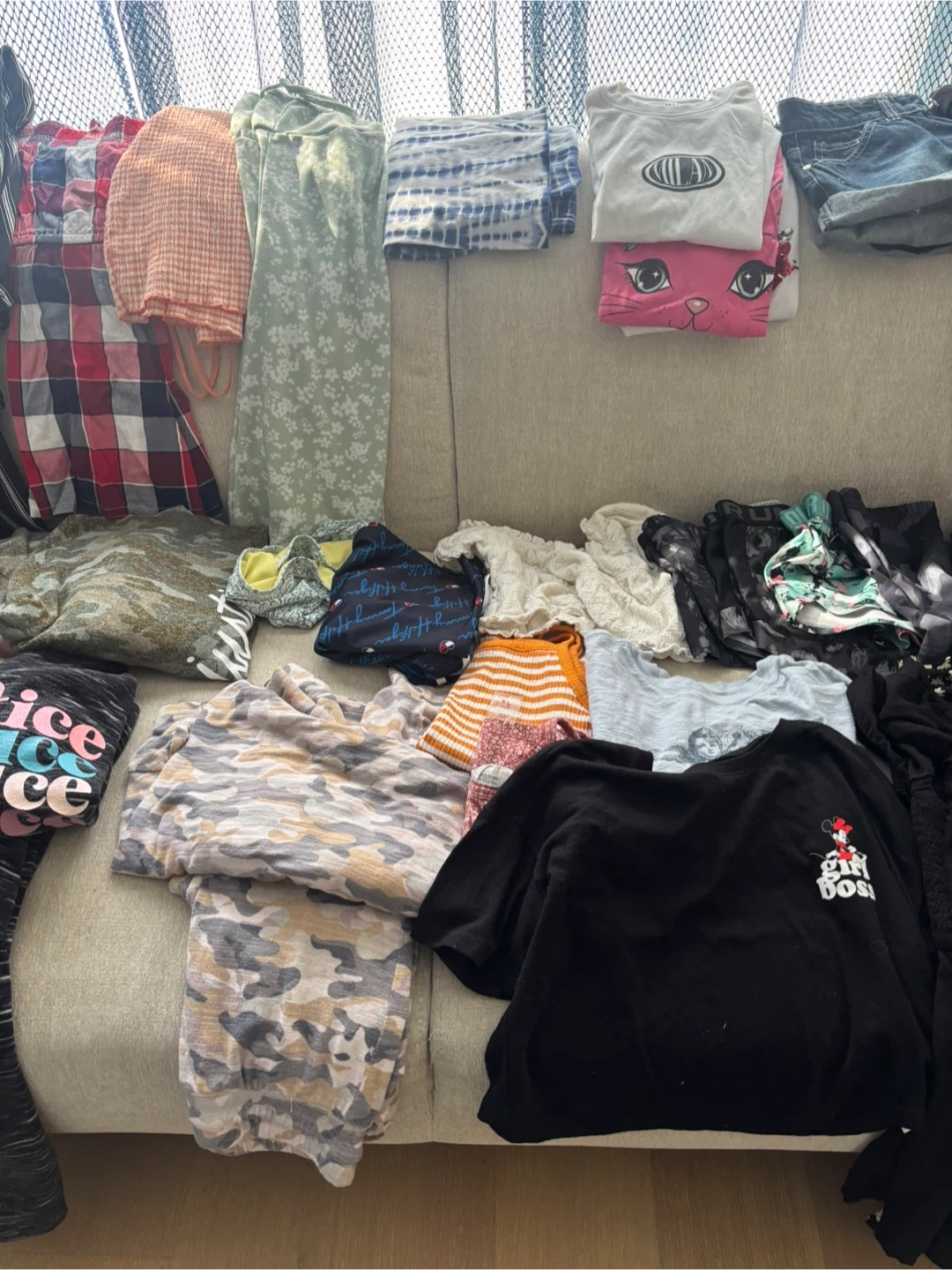 A collection of girls' clothing items including tops, dresses, jeans, and more. Various sizes and styles are included. Perfect for a kid's wardrobe refresh!
