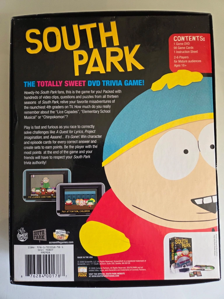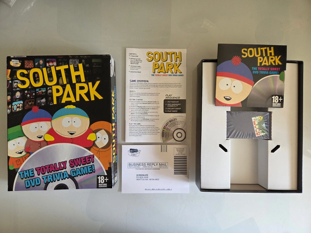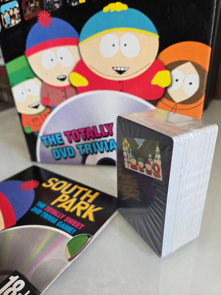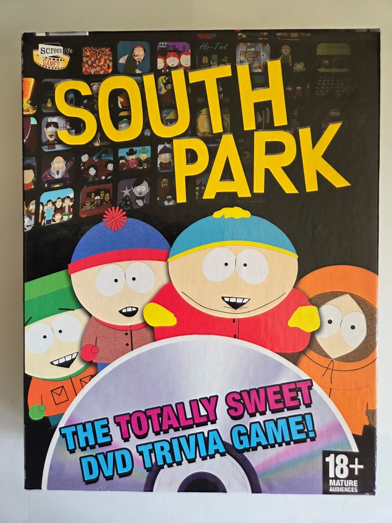 Selling the South Park Totally Sweet DVD Trivia Game! It includes 1 game DVD, game cards, and an instruction sheet. It's designed for 2-8 players and mature audiences (18+). Components still sealed. Never used.