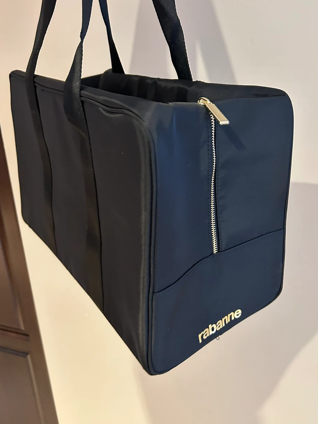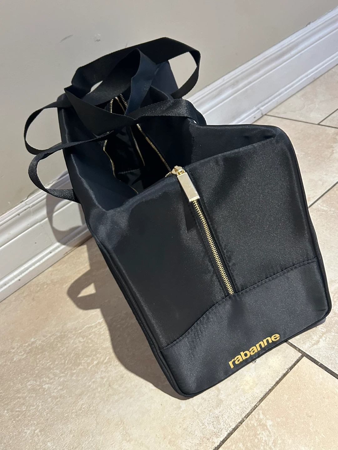 This is a black nylon duffle bag by Rabanne. It features gold-tone zippers and dual top handles. Its compact size makes it handy for travel or everyday use.