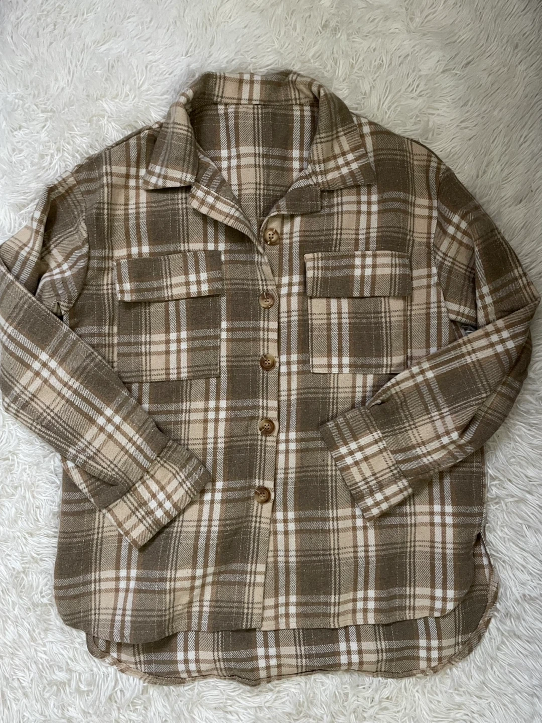 Cozy brown plaid shirt jacket with two chest pockets. Buttons up the front. It's made from a soft flannel material. This shirt is great for layering on cooler days!