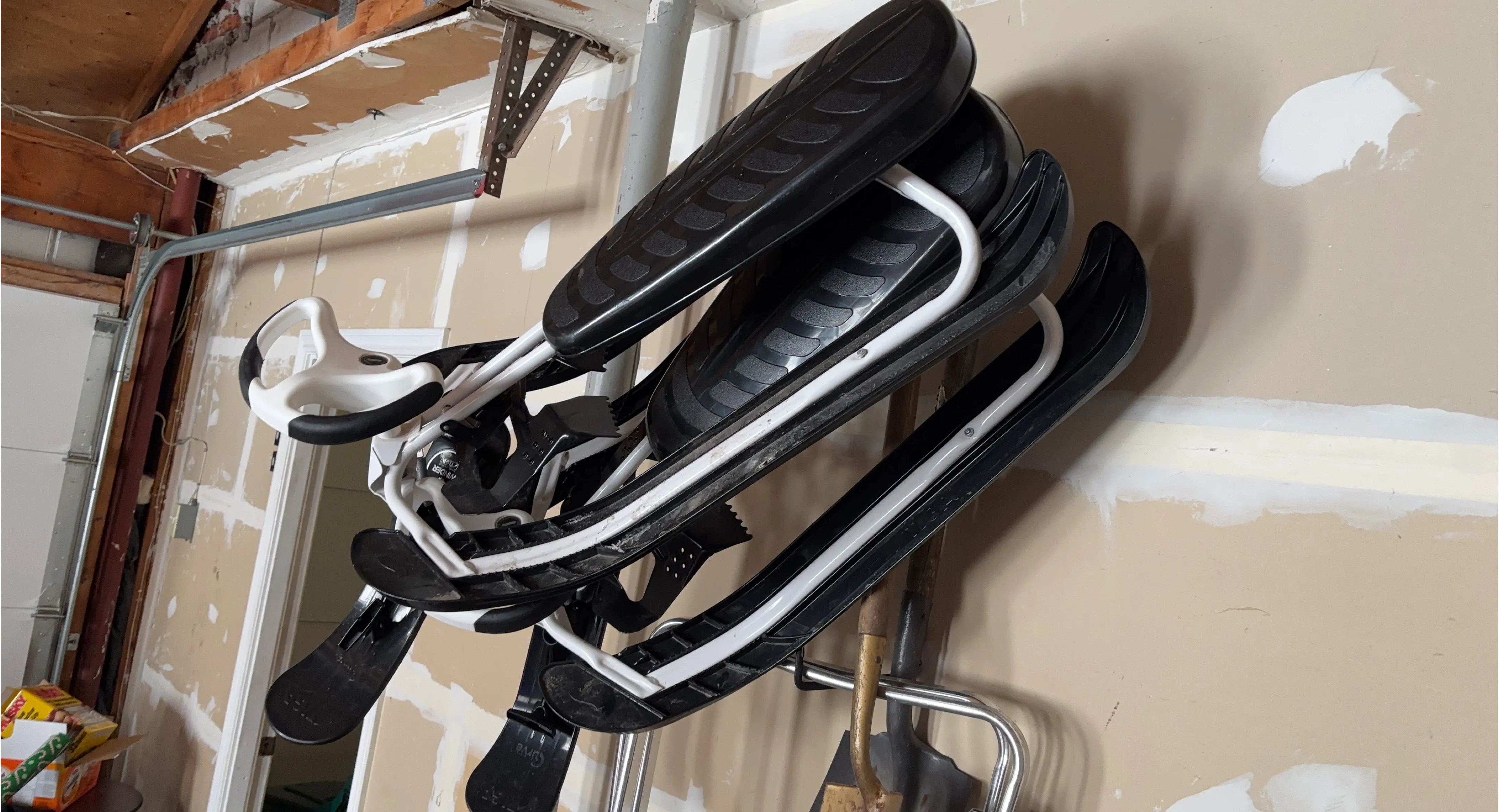 This is a Snow Racer steering sled. It's black and white with a steering wheel for control. Made of sturdy plastic for fun on the snow! 2 available.