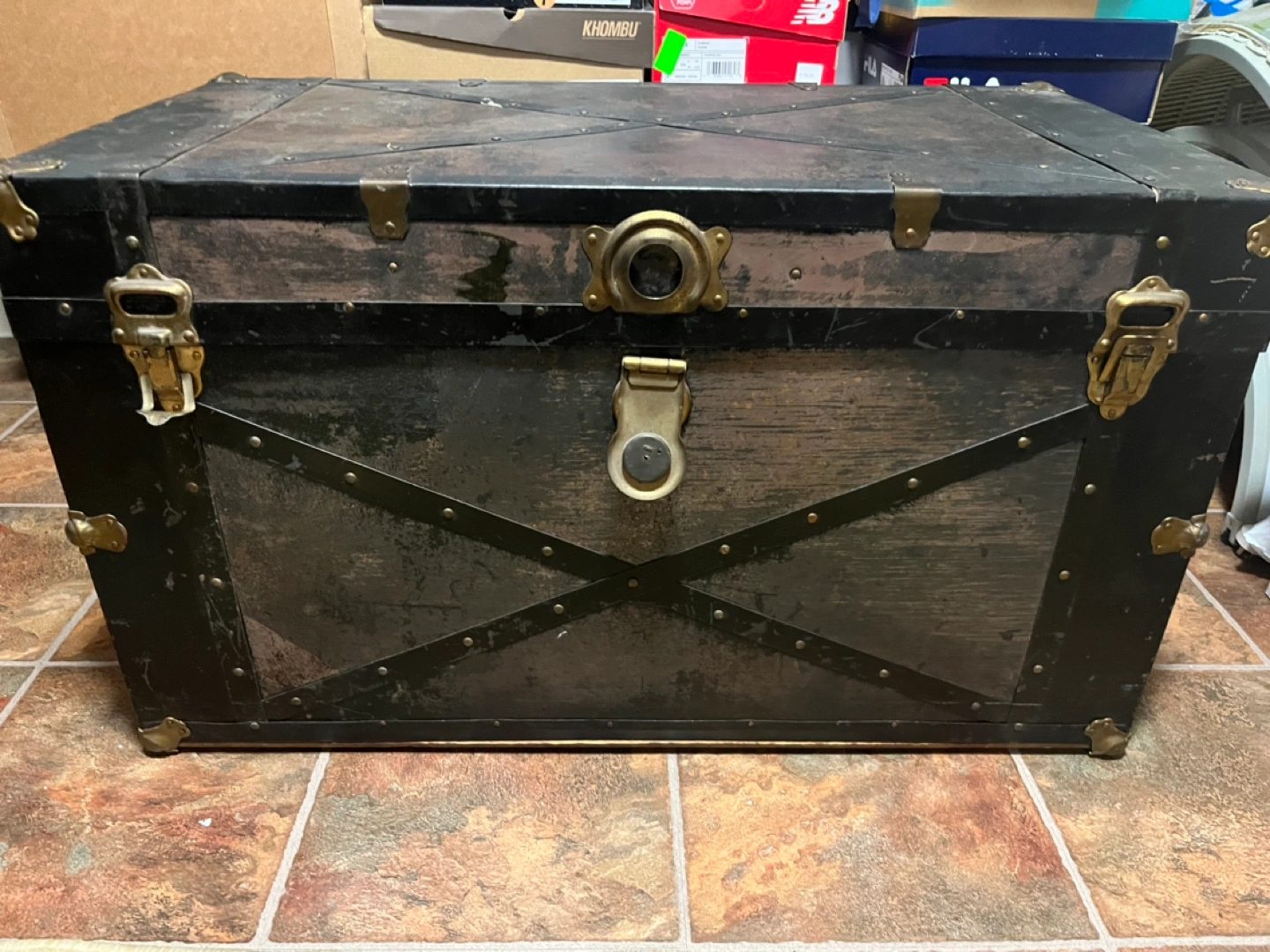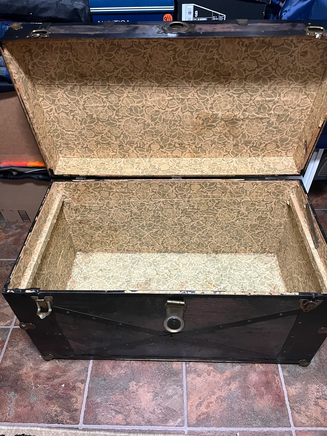 Large vintage trunk. Metal accents and clasps. Floral interior lining. Shows signs of age and wear. Great for storage or as a decorative piece.