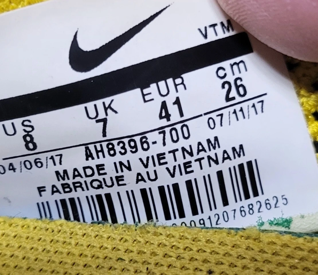 Yellow and black Nike Flyknit Trainer running shoes. US Men's size 8, EU size 41, UK size 7, CM size 26. Made in Vietnam. Great for training or casual wear!