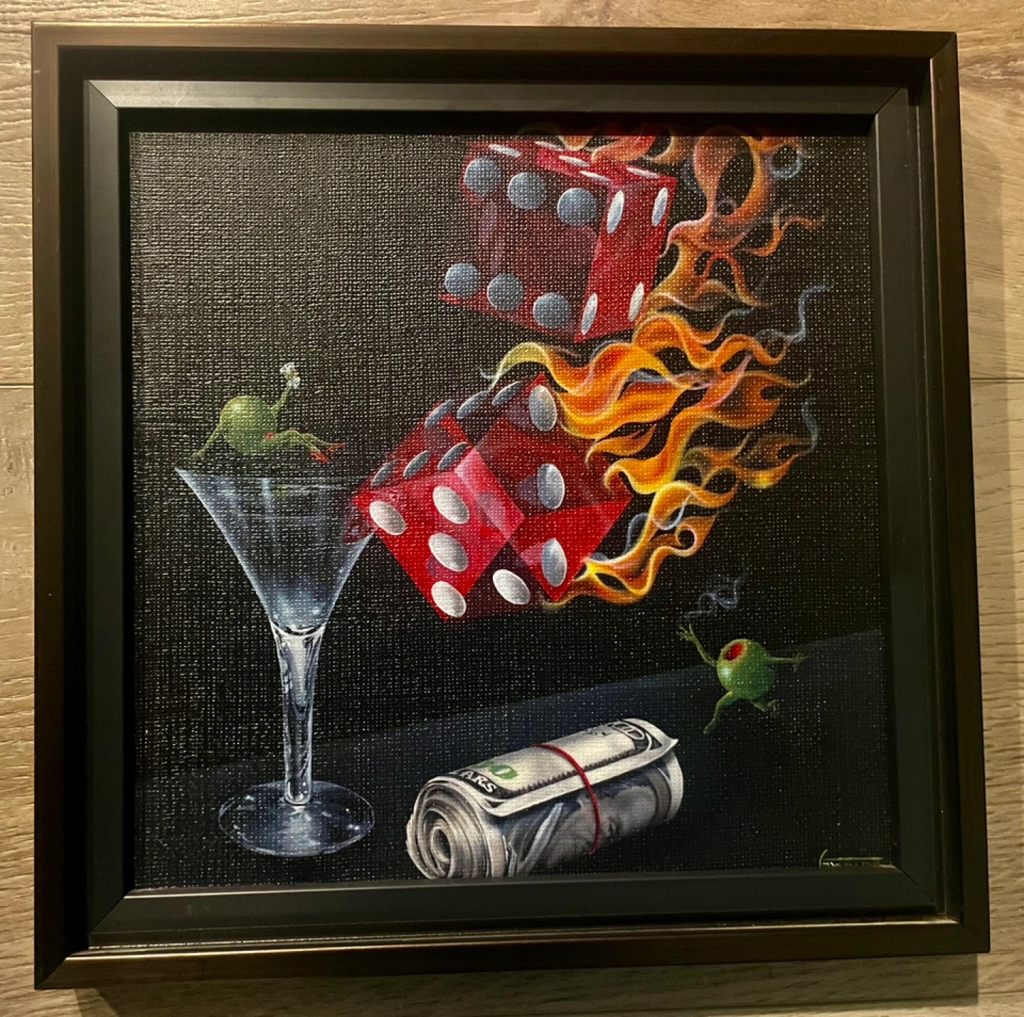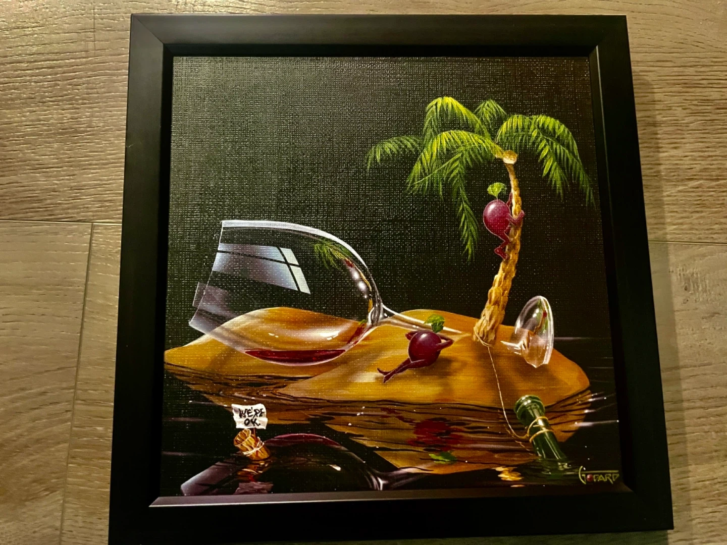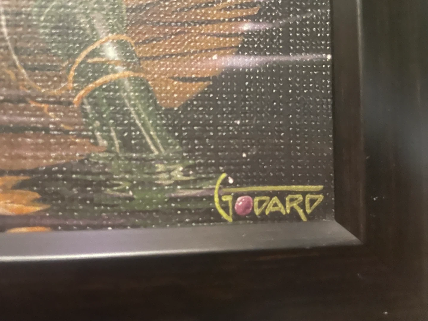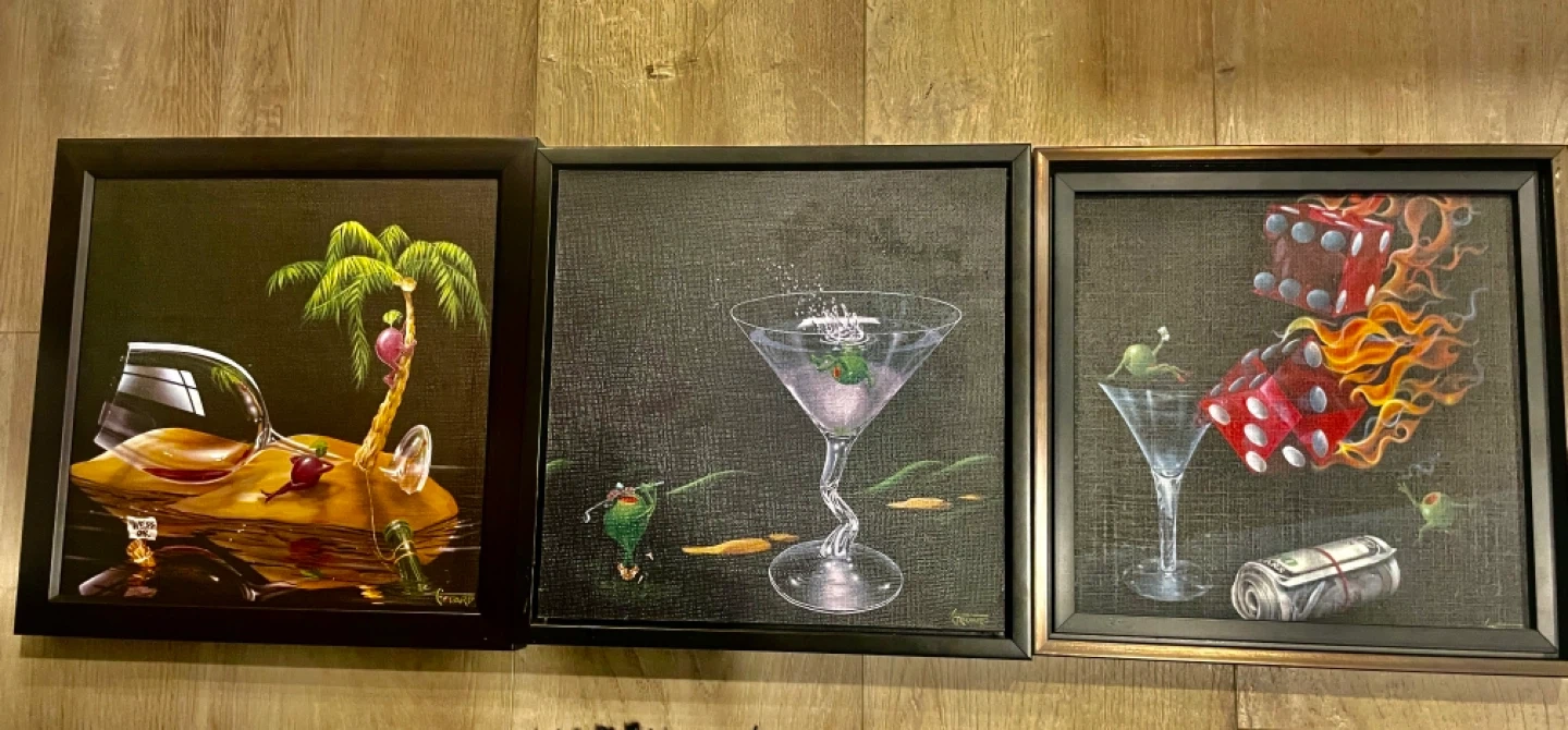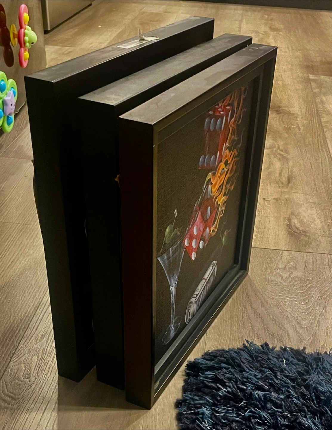 Selling a set of three framed art prints on faux canvas by Goddard! Each print features a unique and whimsical design. They'd be a great addition to any home or bar area. Depictions of each piece or in the pictures. Varying in sizes but approx. 13” x 13” and up (give or take an inch squared)