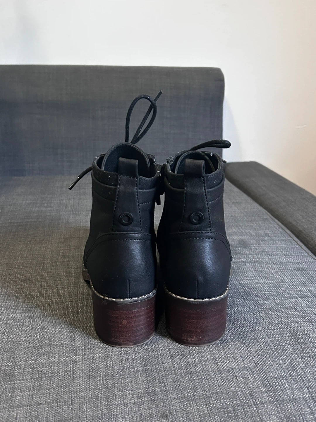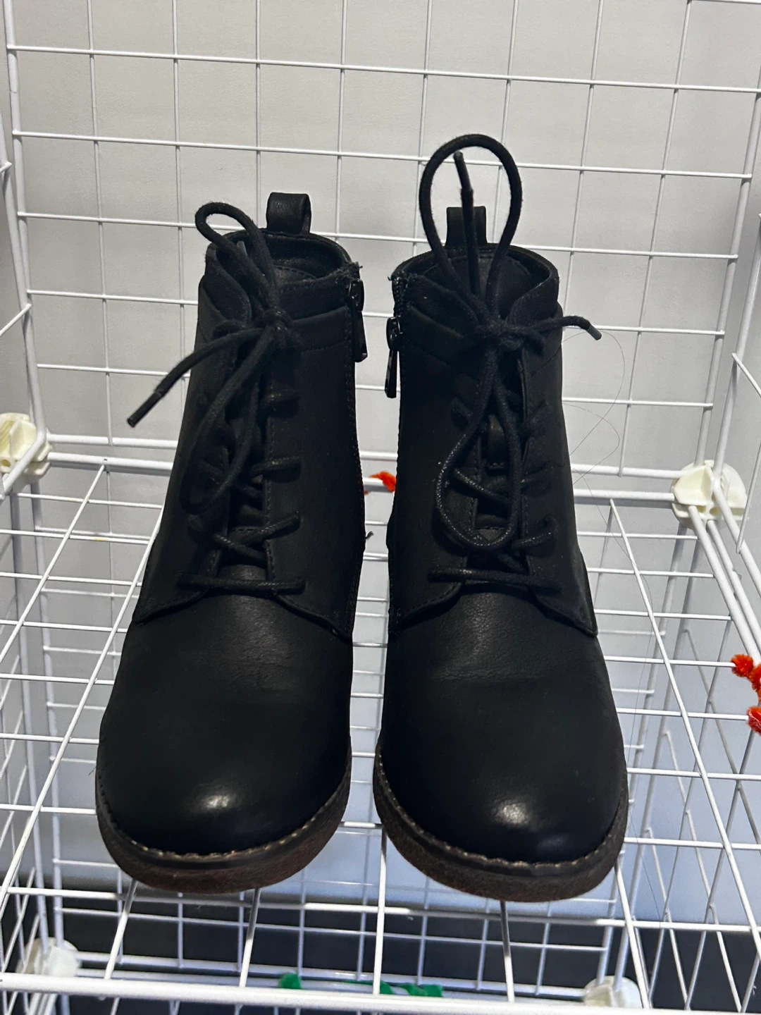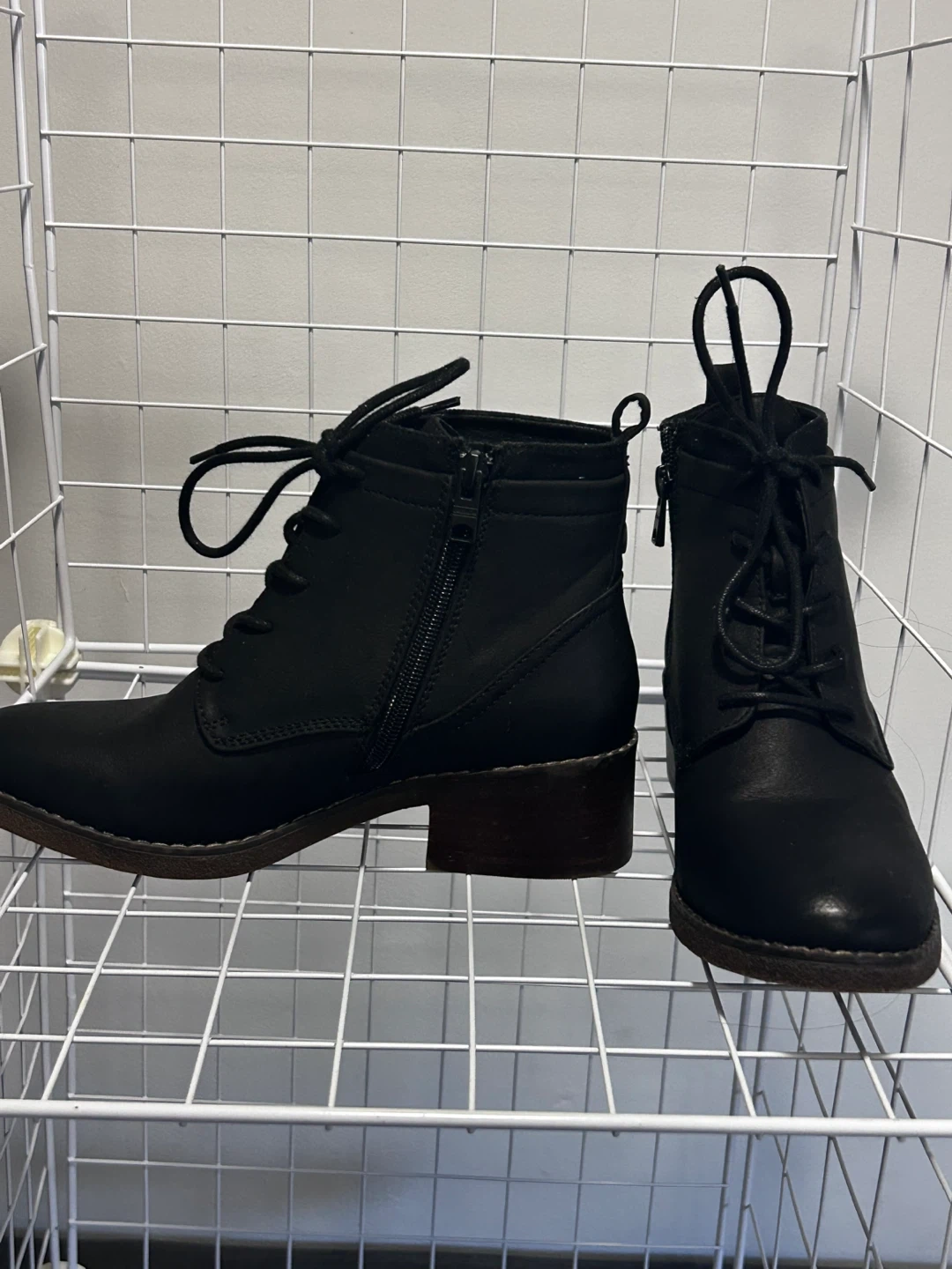 Selling a pair of black ankle boots with a lace-up front and a side zipper. They have a low heel and are in good condition. Perfect for fall or winter!