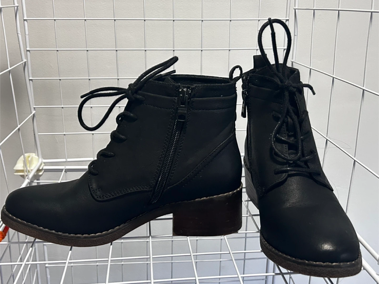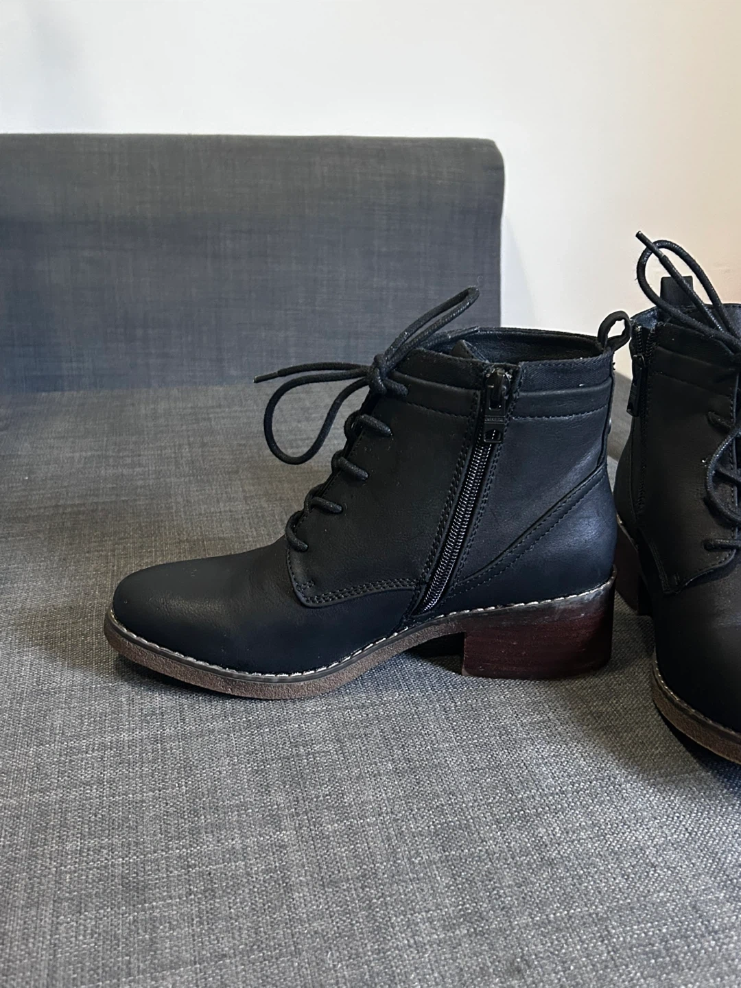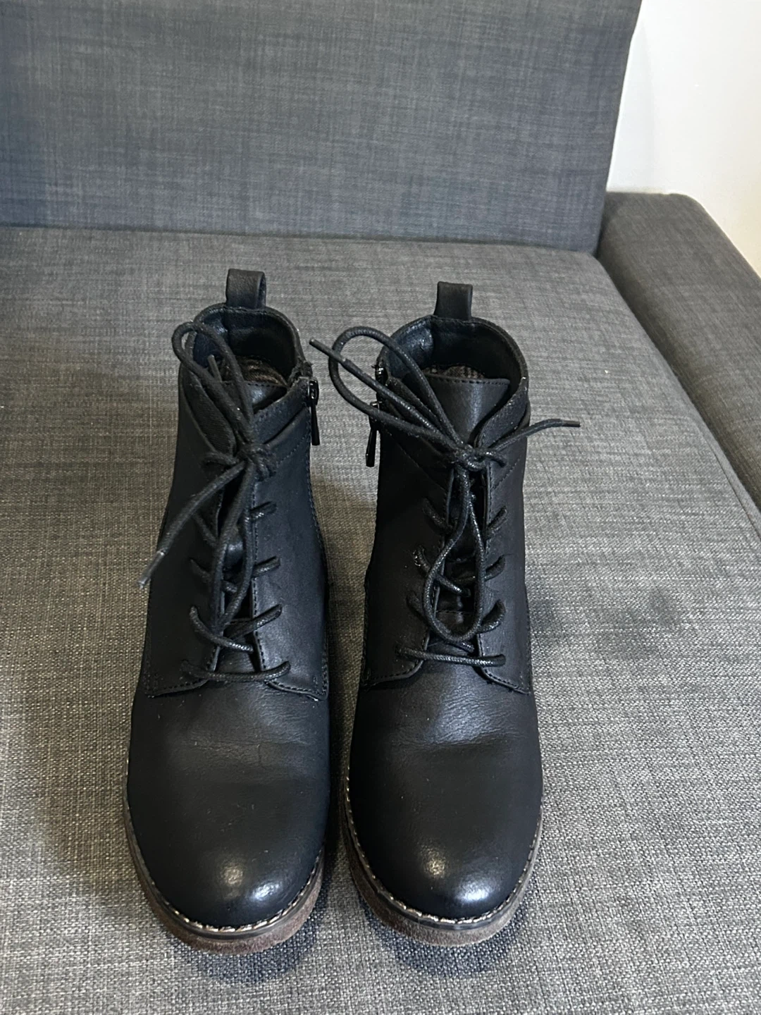 Selling a pair of black ankle boots with a lace-up front and a side zipper. They have a low heel and are in good condition. Perfect for fall or winter!