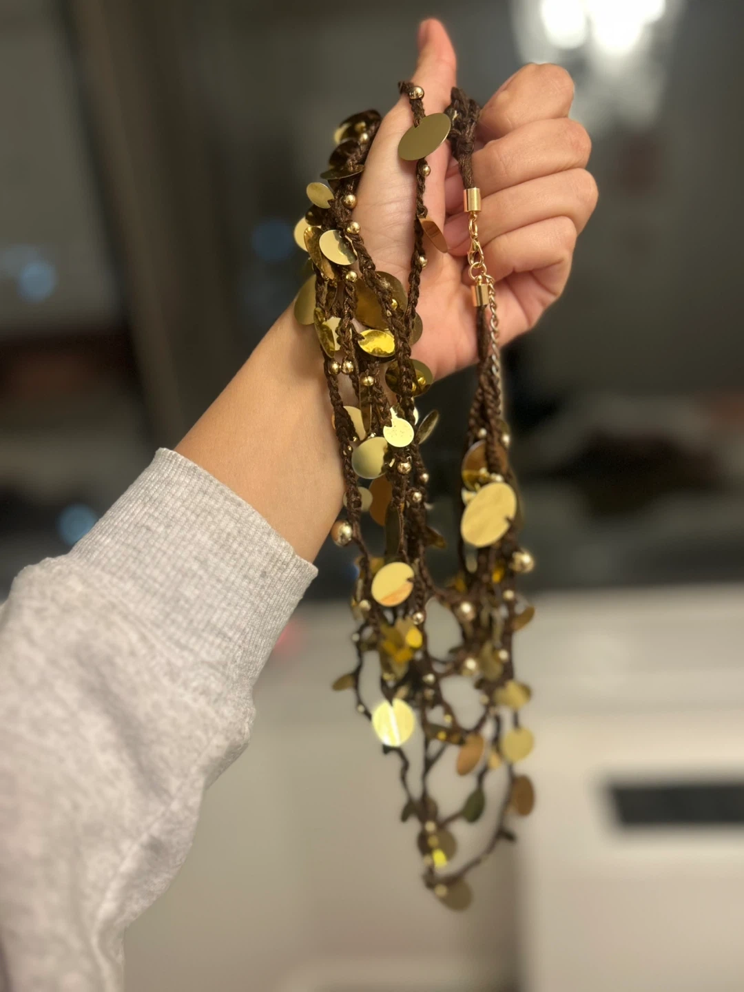 A beautiful brown crocheted necklace adorned with gold sequins and small beads. It features a secure gold-tone clasp closure. This statement necklace adds a touch of sparkle into any outfit!
