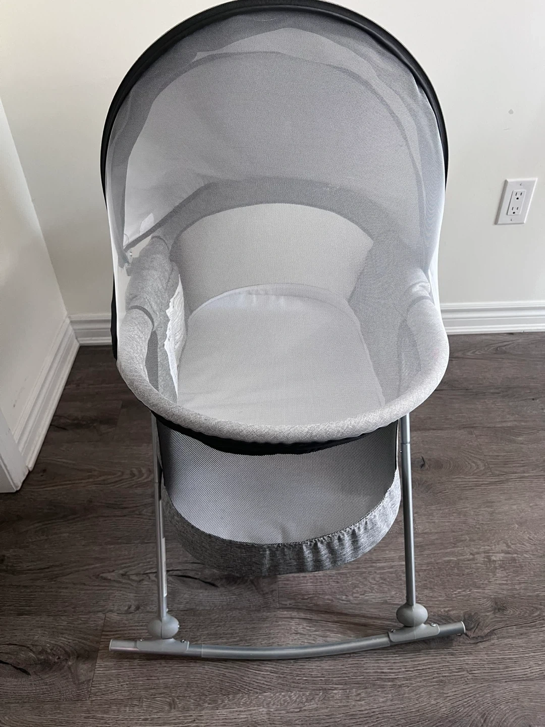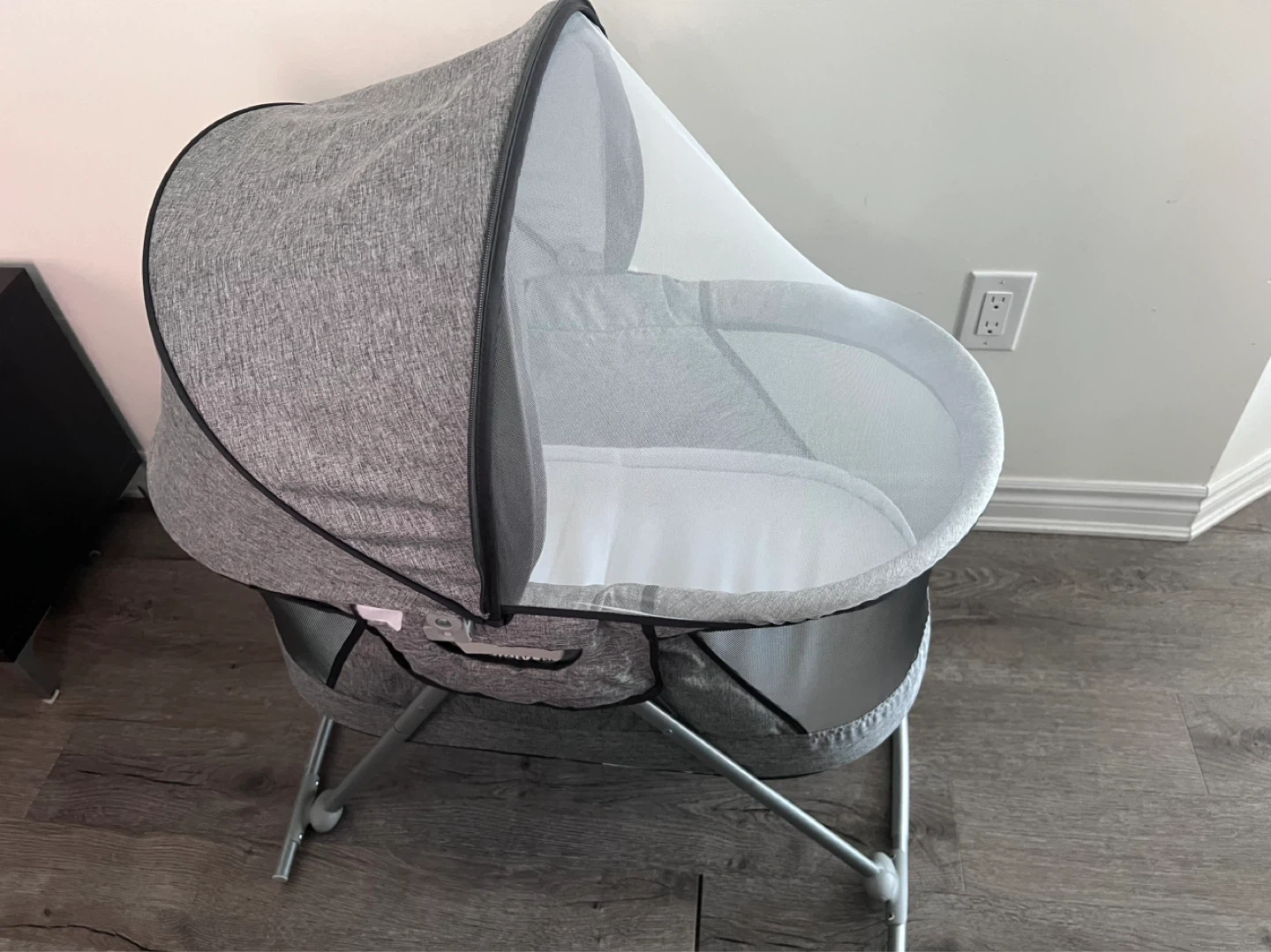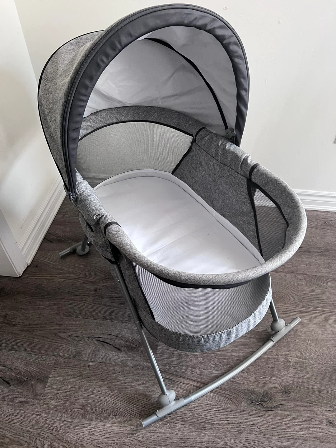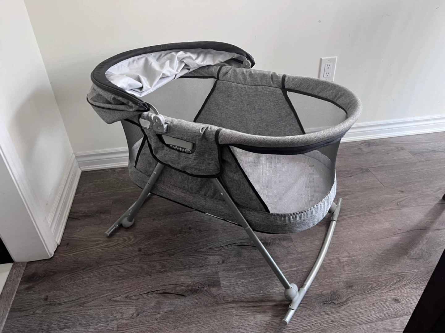 This Safety 1st bassinet is designed for newborns. It features a comfy mattress and a canopy with a mosquito net. The frame is grey with black accents and has a rocking base.