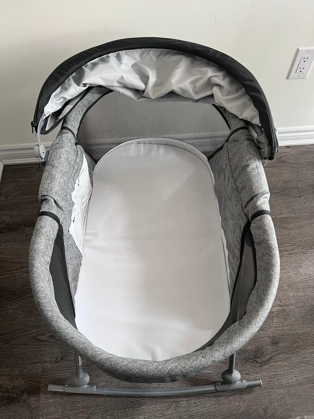 This Safety 1st bassinet is designed for newborns. It features a comfy mattress and a canopy with a mosquito net. The frame is grey with black accents and has a rocking base.