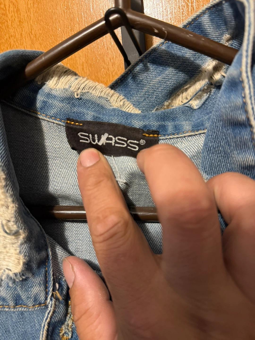 Selling a stylish SWASS denim jacket featuring unique pearl embellishments! This jacket has a distressed look with some rips and tears, giving it an edgy vibe. Perfect for adding a bit of flair to your outfit!