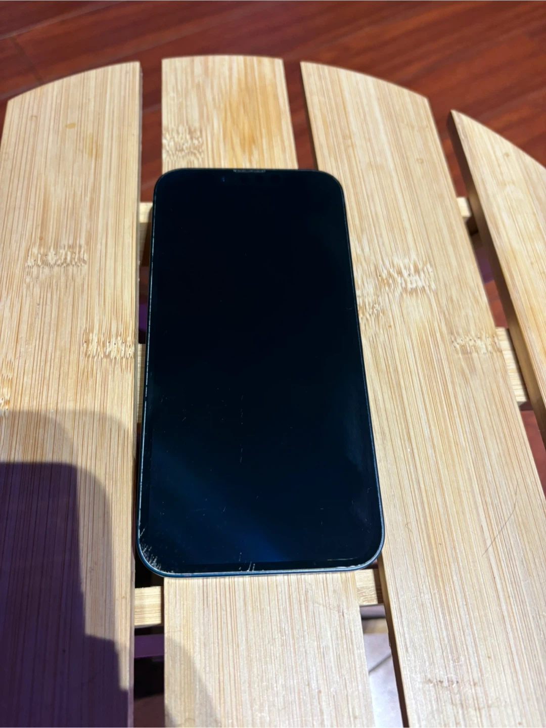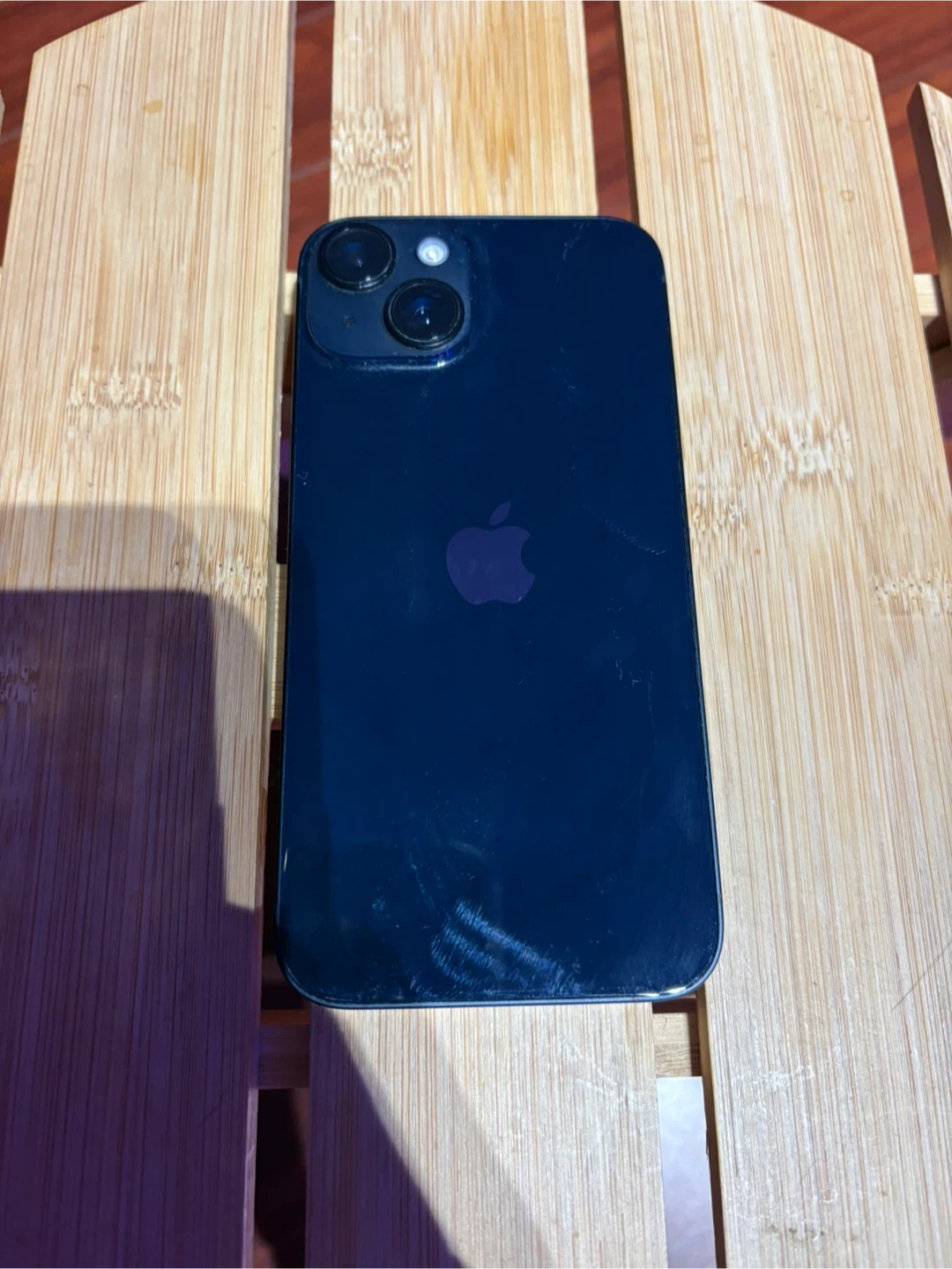 Selling an Apple iPhone 14 in black. It has some signs of use, but is still in good working condition. No cracks. A few minor scratches on the edge.