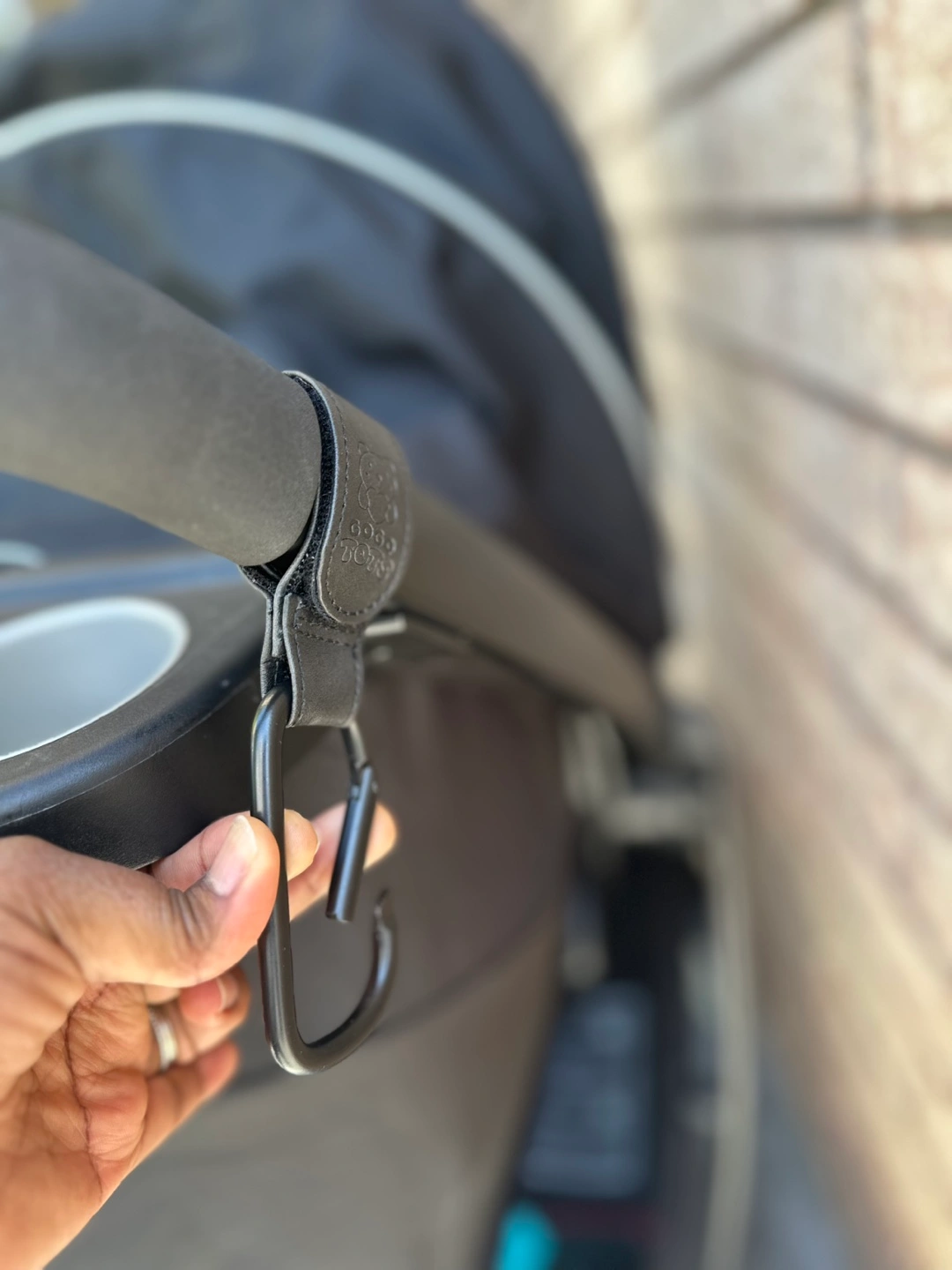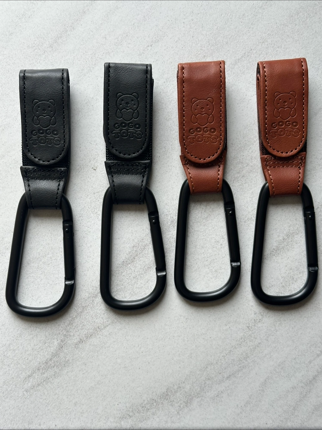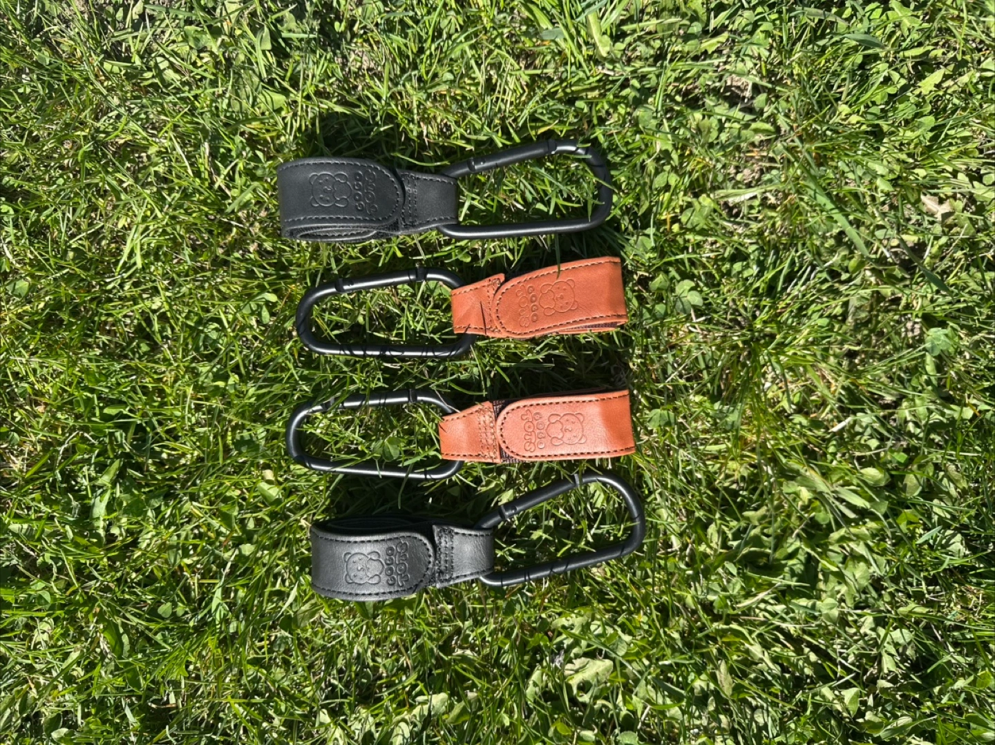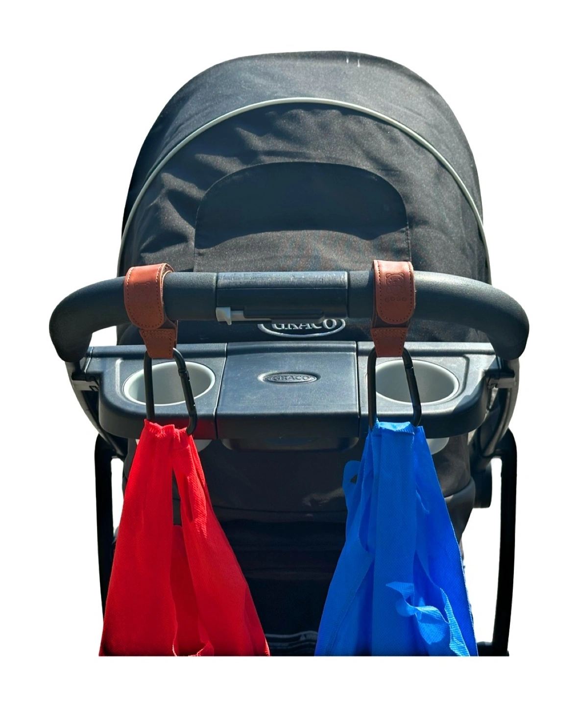 Vegan leather Velcro straps with hooks. Holds up to 11 pounds each - that is 22 pounds off your back and shoulders. Attach grocery bags, shopping bags, handbags, and so much more rather than stuffing everything in the stroller basket. Local delivery available