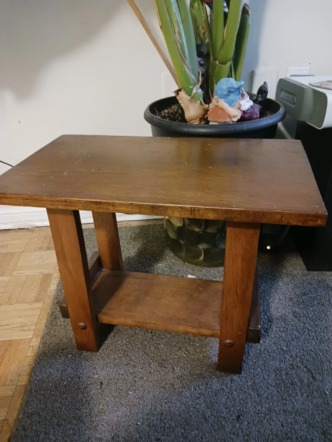 A solid wood side table with a lower shelf. It's a great size for placing next to a couch or armchair. The wood has a natural finish and simple construction.