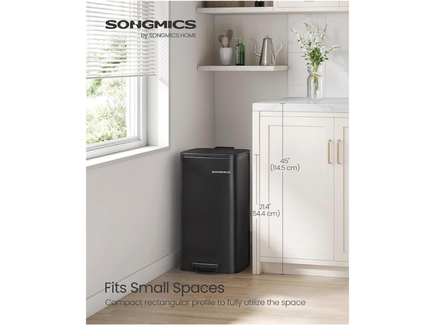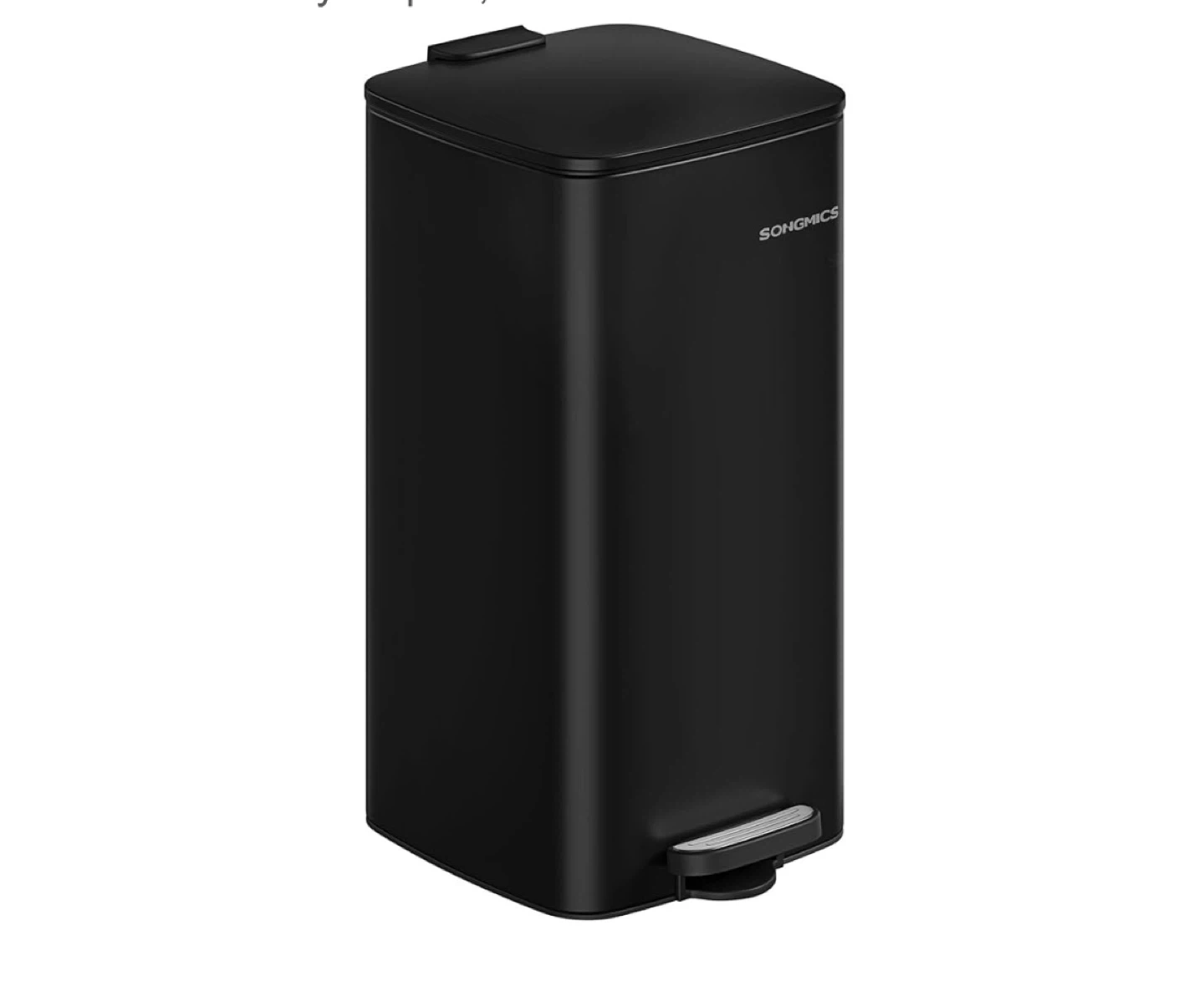 This SONGMICS trash can is black and rectangular with a foot pedal. It's 32.3" (82 cm) tall when open and has a capacity of 8 gallons (30 L). The compact design fits small spaces. This is useful for kitchens or offices.