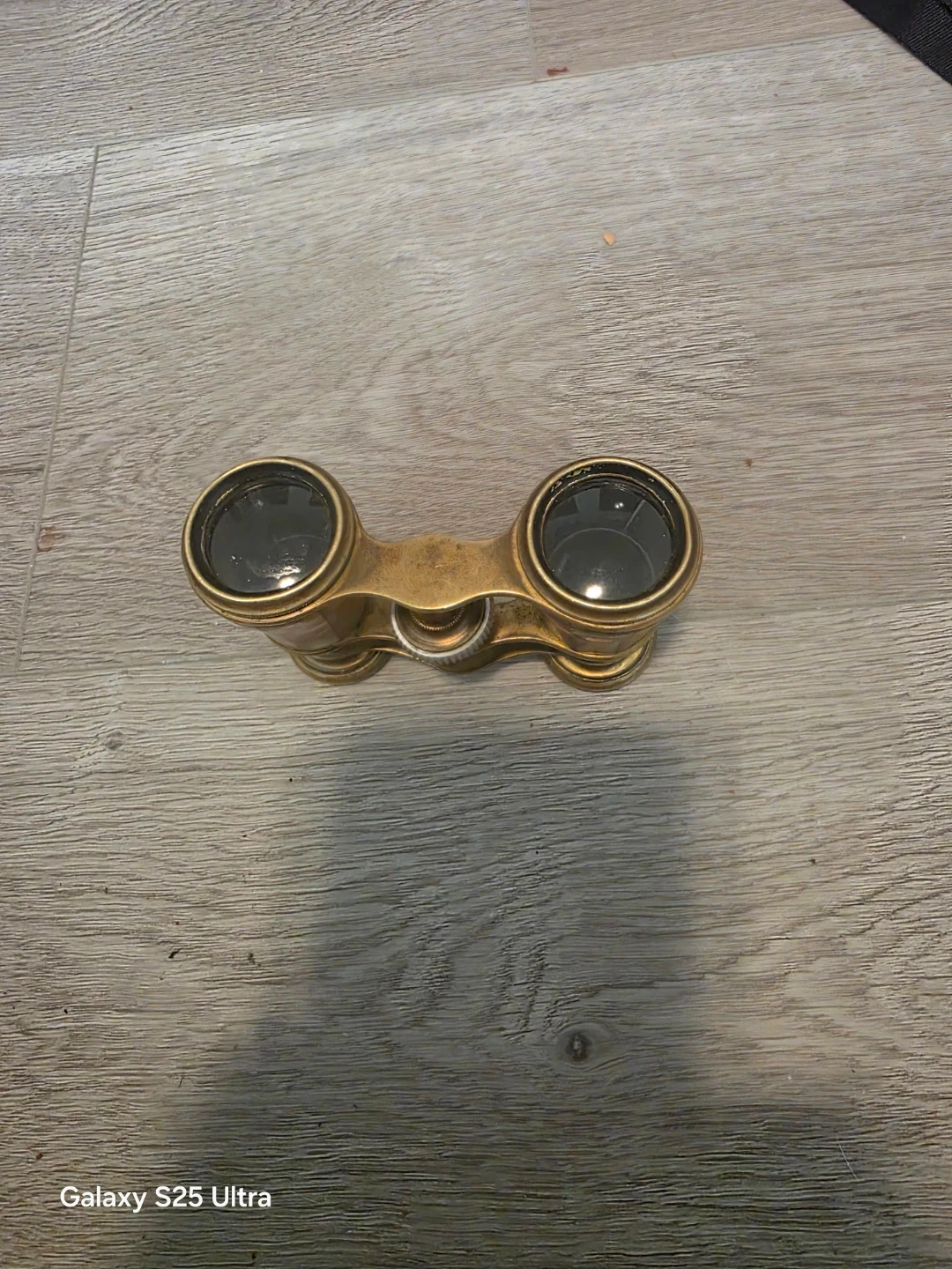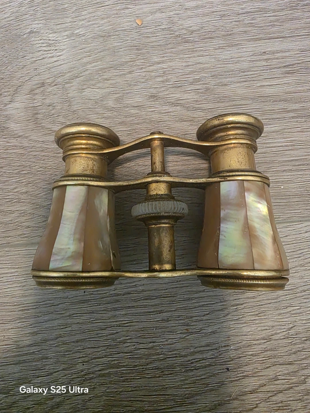 Beautiful vintage opera binoculars with a brass frame and mother of pearl inlay on the barrels. The central focus knob appears functional. These would be stunning for collectors or as a decorative piece!