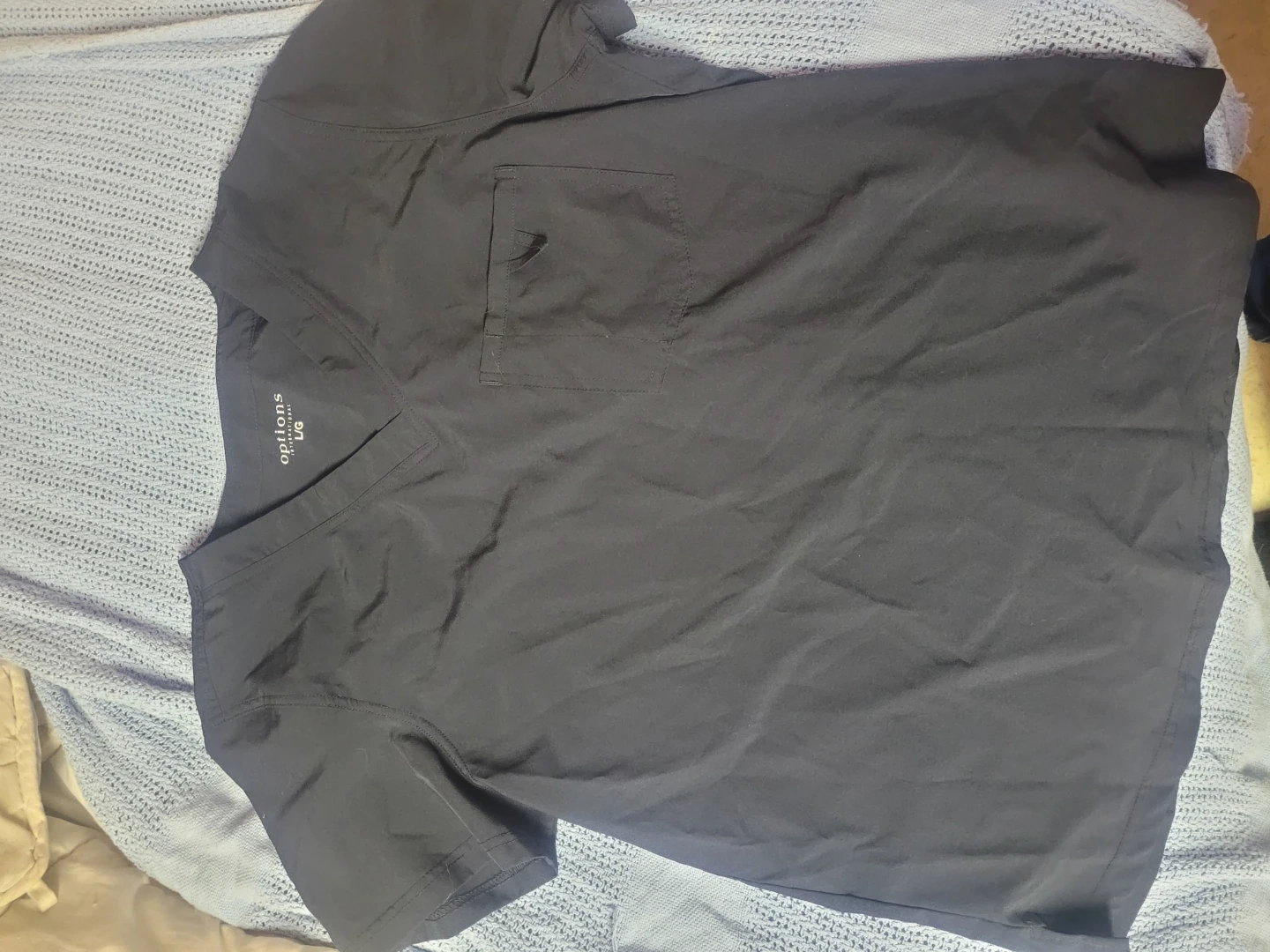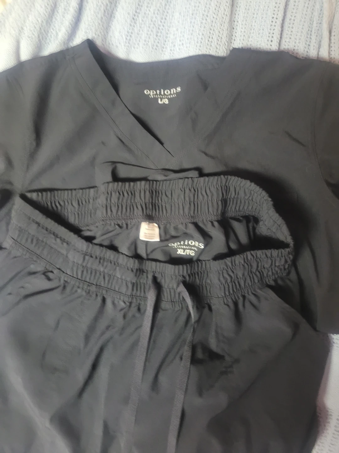 This is a set of black scrub top and pants from Options. The top is size L/G and the pants are size XL/TG. It's made of a comfortable, durable fabric. Tags removed and washed, never worn.