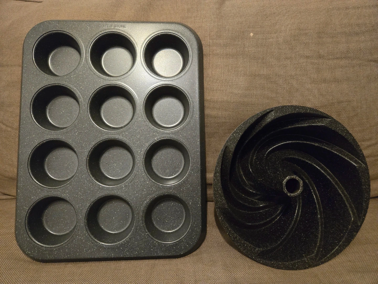 This set includes a Nordic Ware Heritage Bundt cake pan and a 12-cup muffin baking pan. Both are made of heavy metal for durable baking. They're great for making your favourite cakes and muffins!
