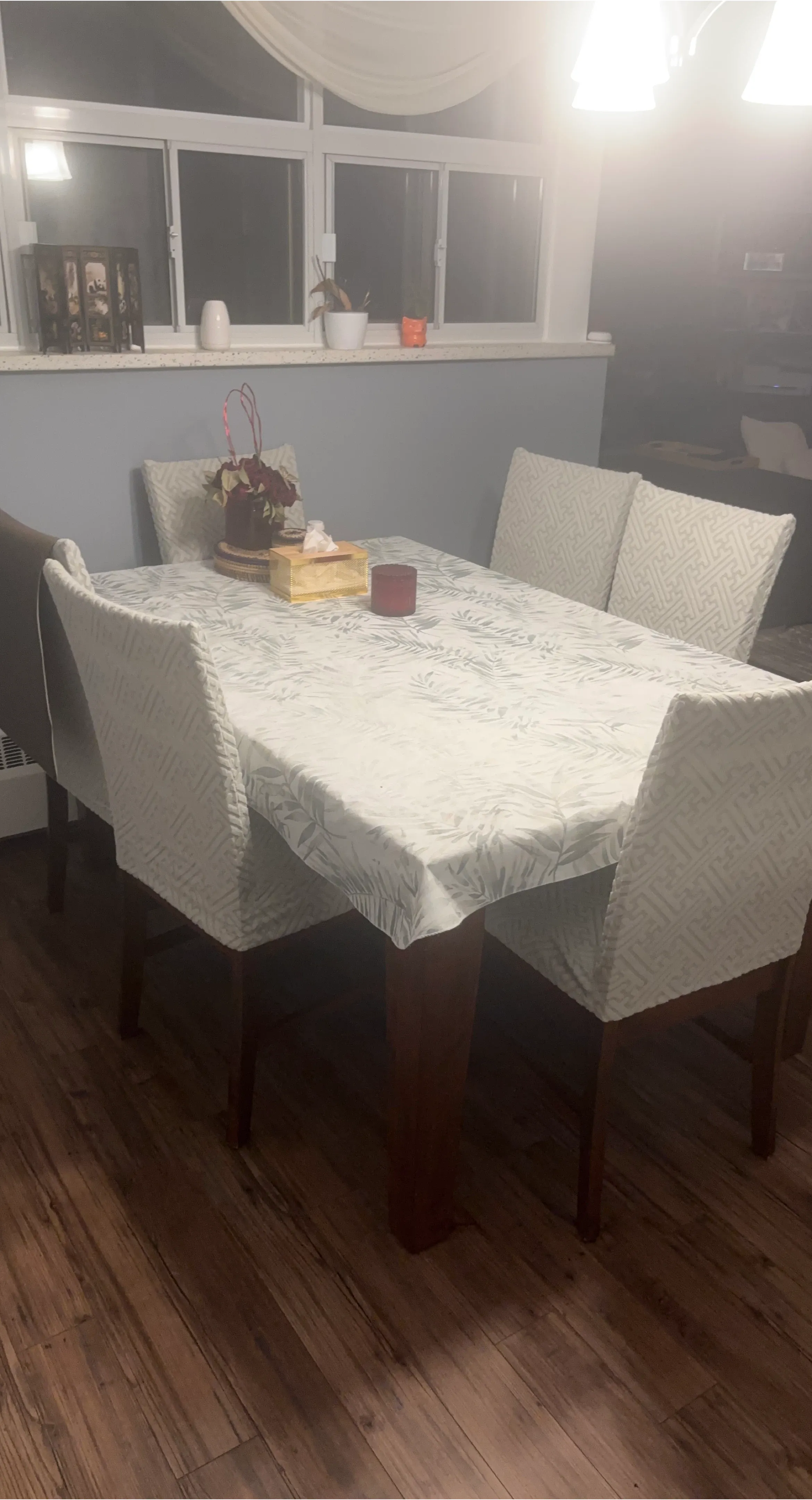 A sturdy dining table with a leaf pattern tablecloth, accompanied by four chairs featuring decorative patterned slipcovers. The set includes a decorative centerpiece with flowers, a tissue box holder, and a candle. Wood flooring not included.