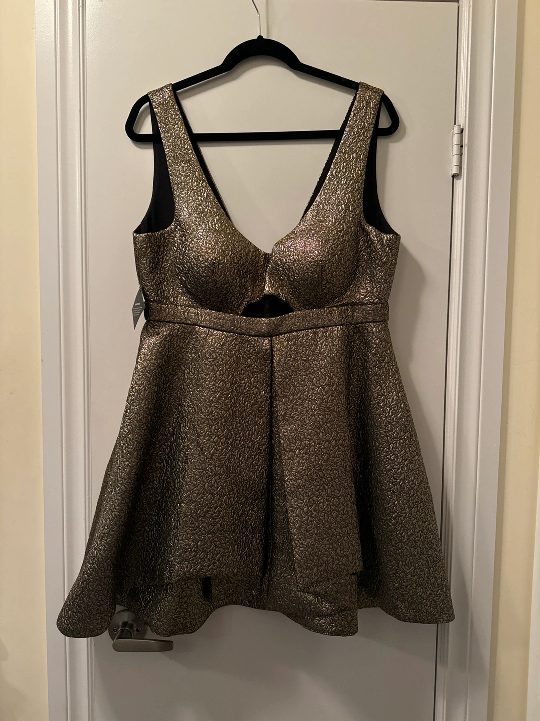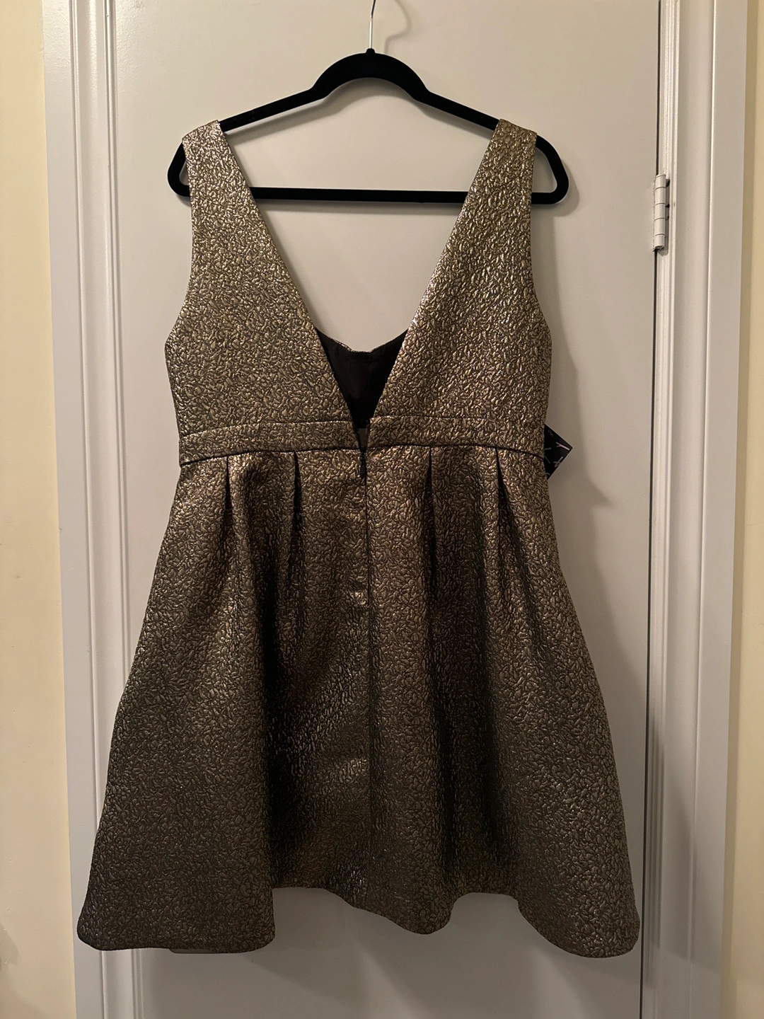 A sleeveless, sparkly gold dress with a deep V-neck and a keyhole detail.