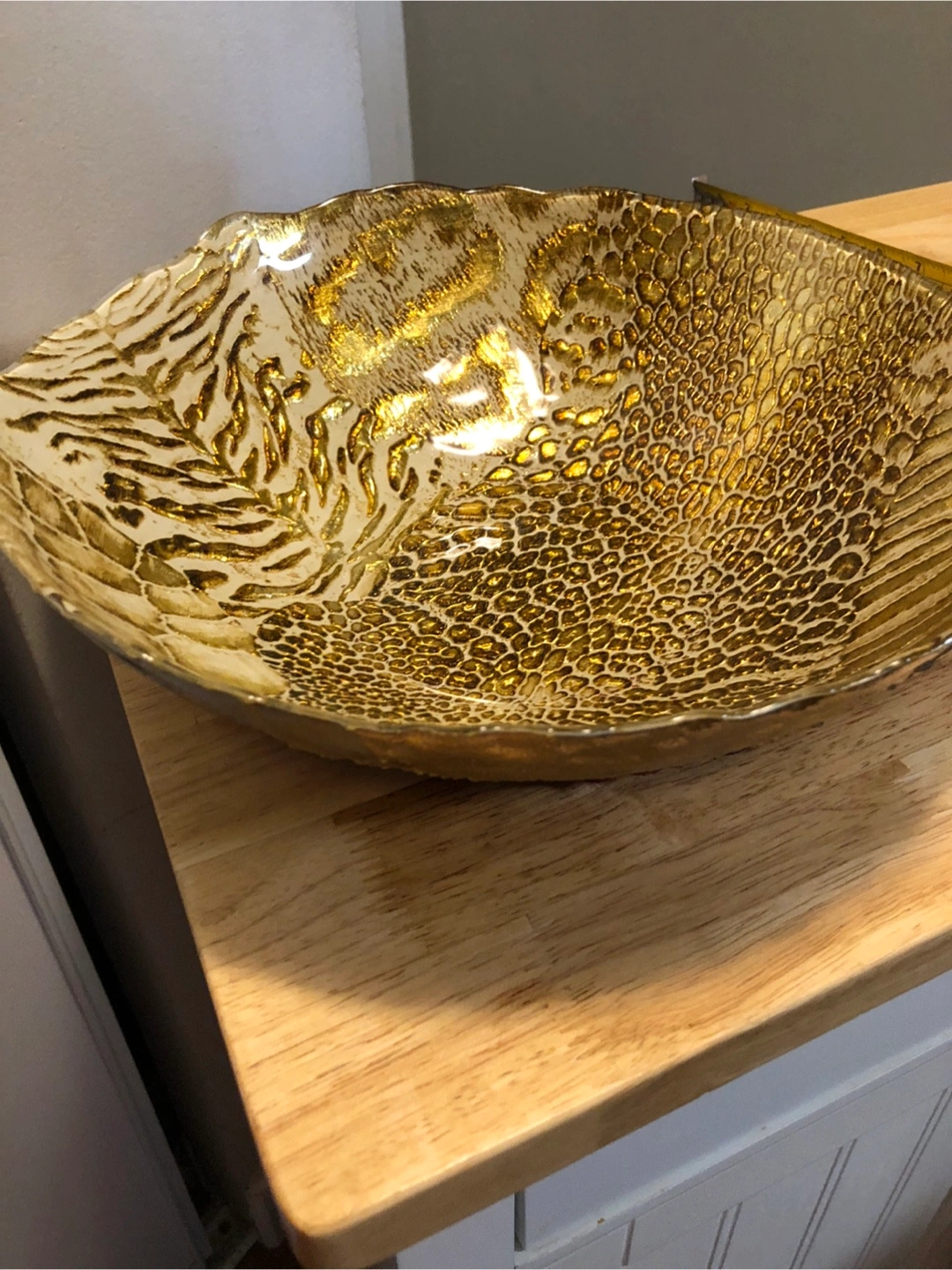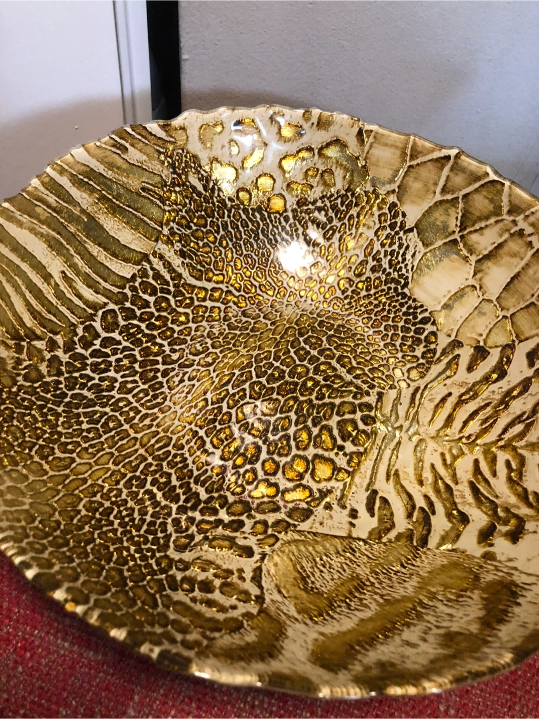 Large decorative bowl. Gold and beige colours. Unique textured design. Looks great as a centerpiece or for serving.