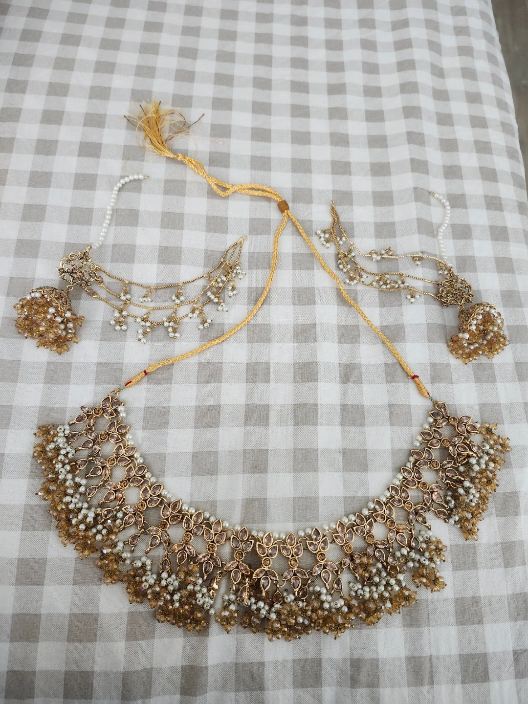 251Gorgeous bridal necklace set. Features a choker necklace and matching earrings. Gold tone metal with pearls and crystals.