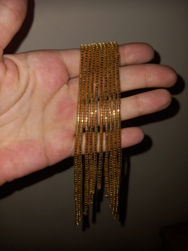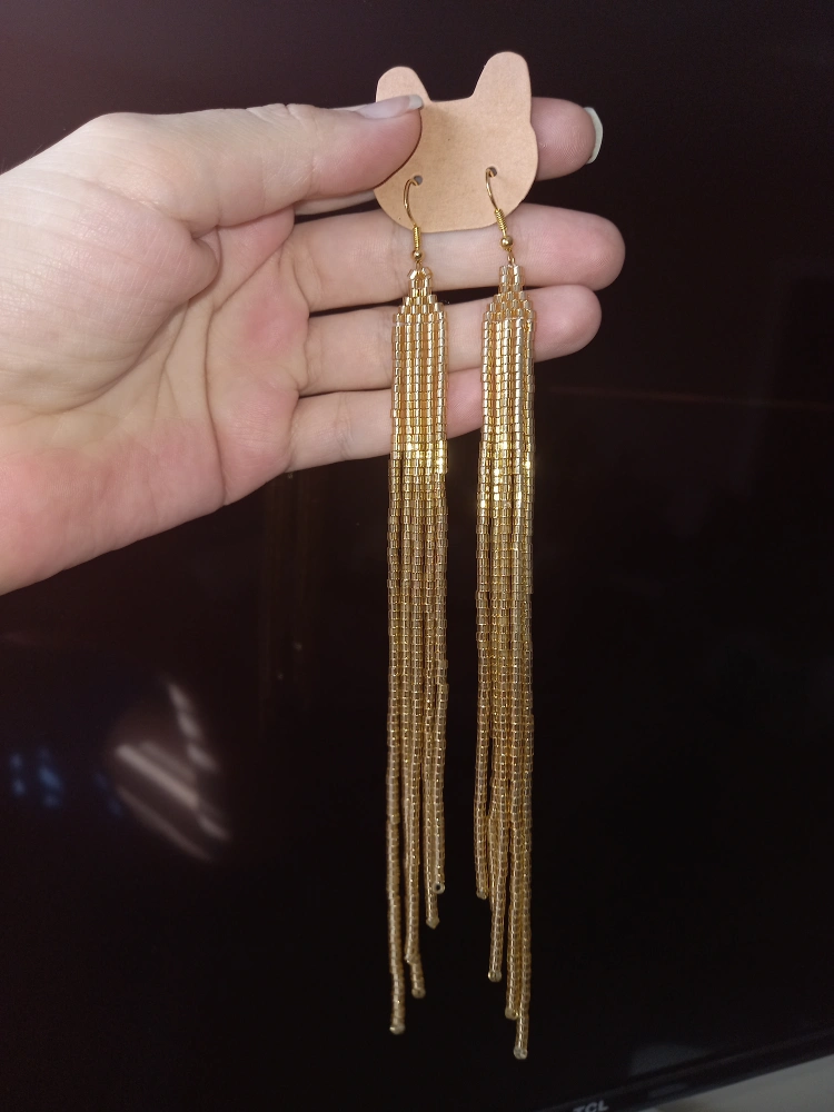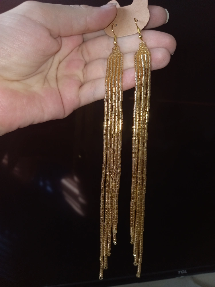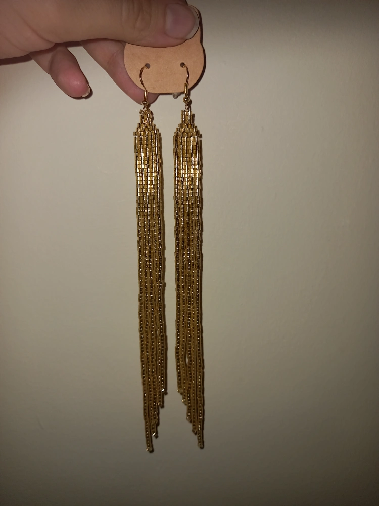 Selling a pair of gold beaded tassel earrings. They are very long and eye-catching. Perfect for a night out or a special occasion!