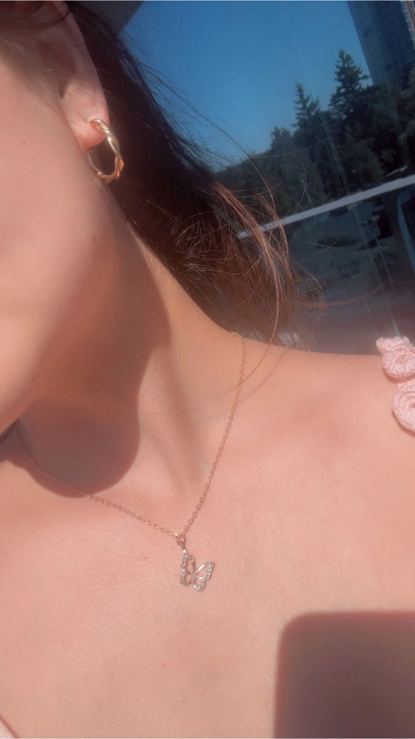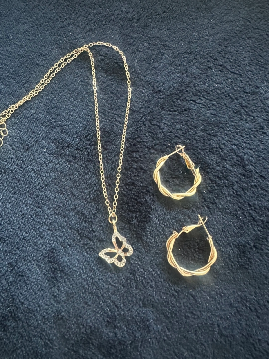 15Cute gold-tone necklace with a butterfly pendant and matching hoop earrings. Perfect for adding a little sparkle to your outfit!