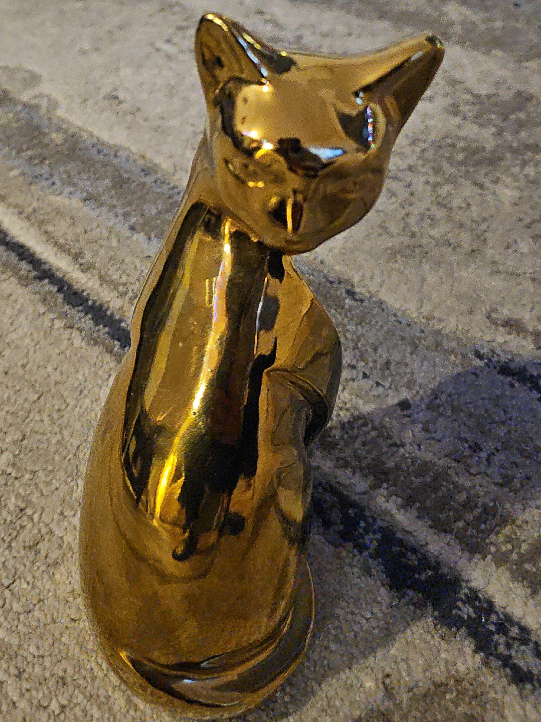 Selling a lovely gold cat figurine! It's in great condition and would look great on a shelf or desk. It has a shiny, reflective finish.