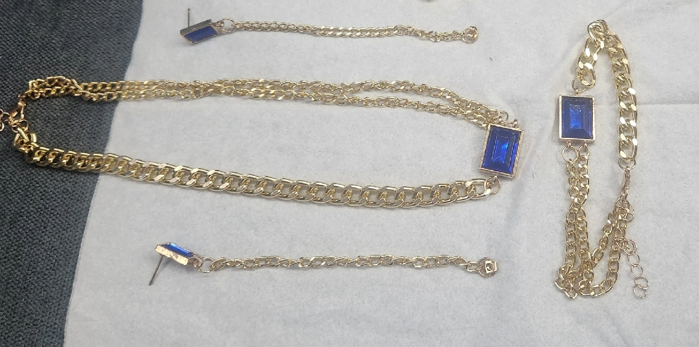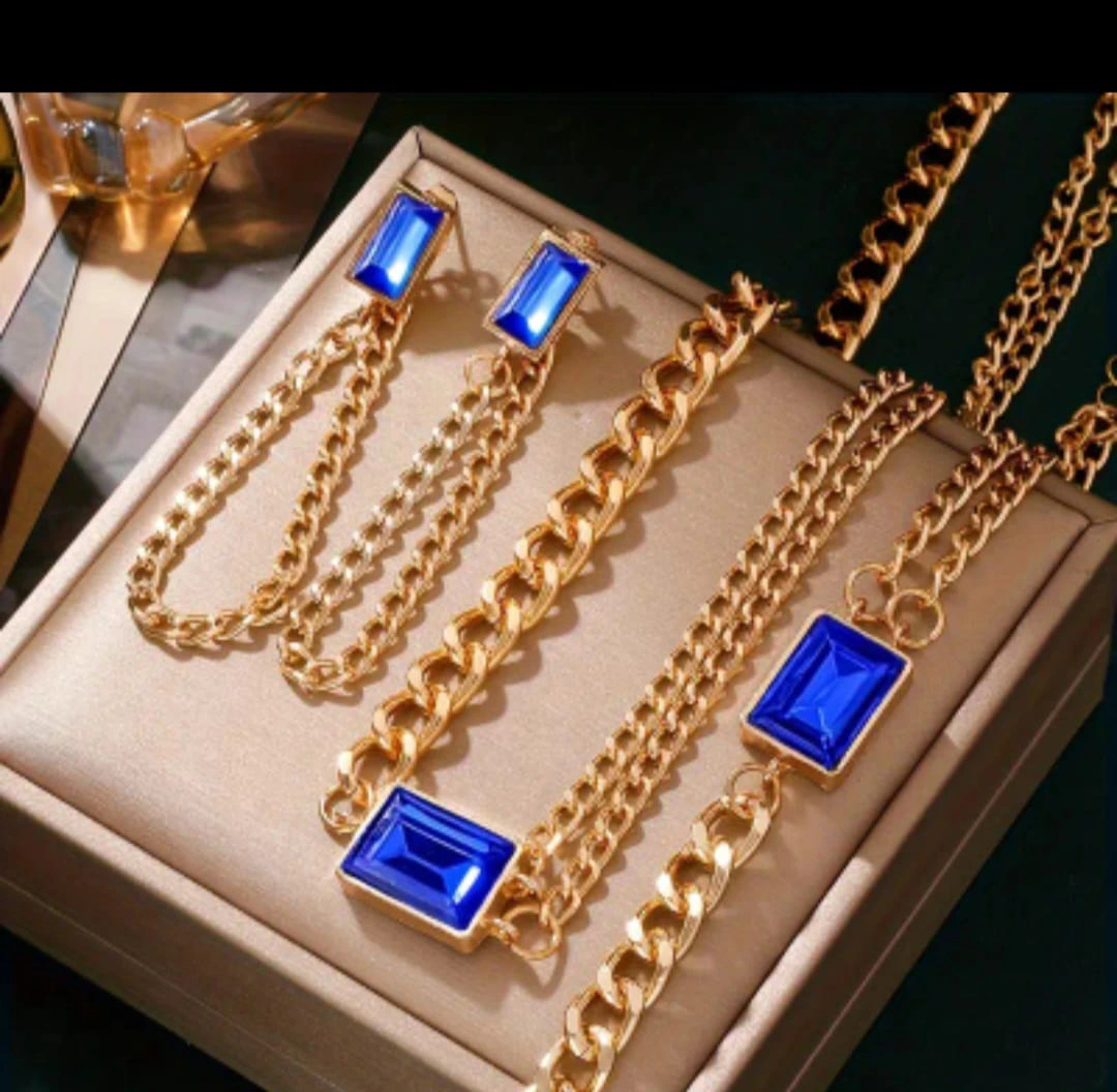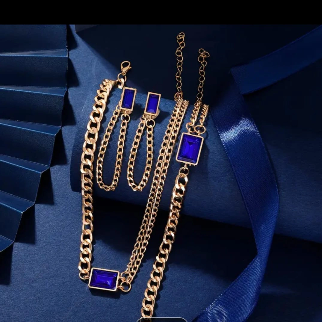 23Selling a beautiful gold chain jewellery set that features striking blue gemstones. This set includes a necklace, bracelet, and earrings, all with a matching design. Perfect for adding a touch of elegance to any outfit!
