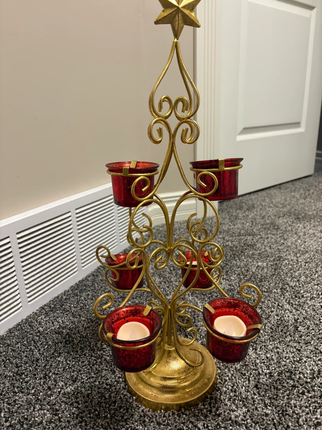 42Add a touch of festive charm to your home with this gold Christmas tree candle holder! It features red glass candle cups and a star on top. Perfect for creating a warm and inviting atmosphere during the holidays