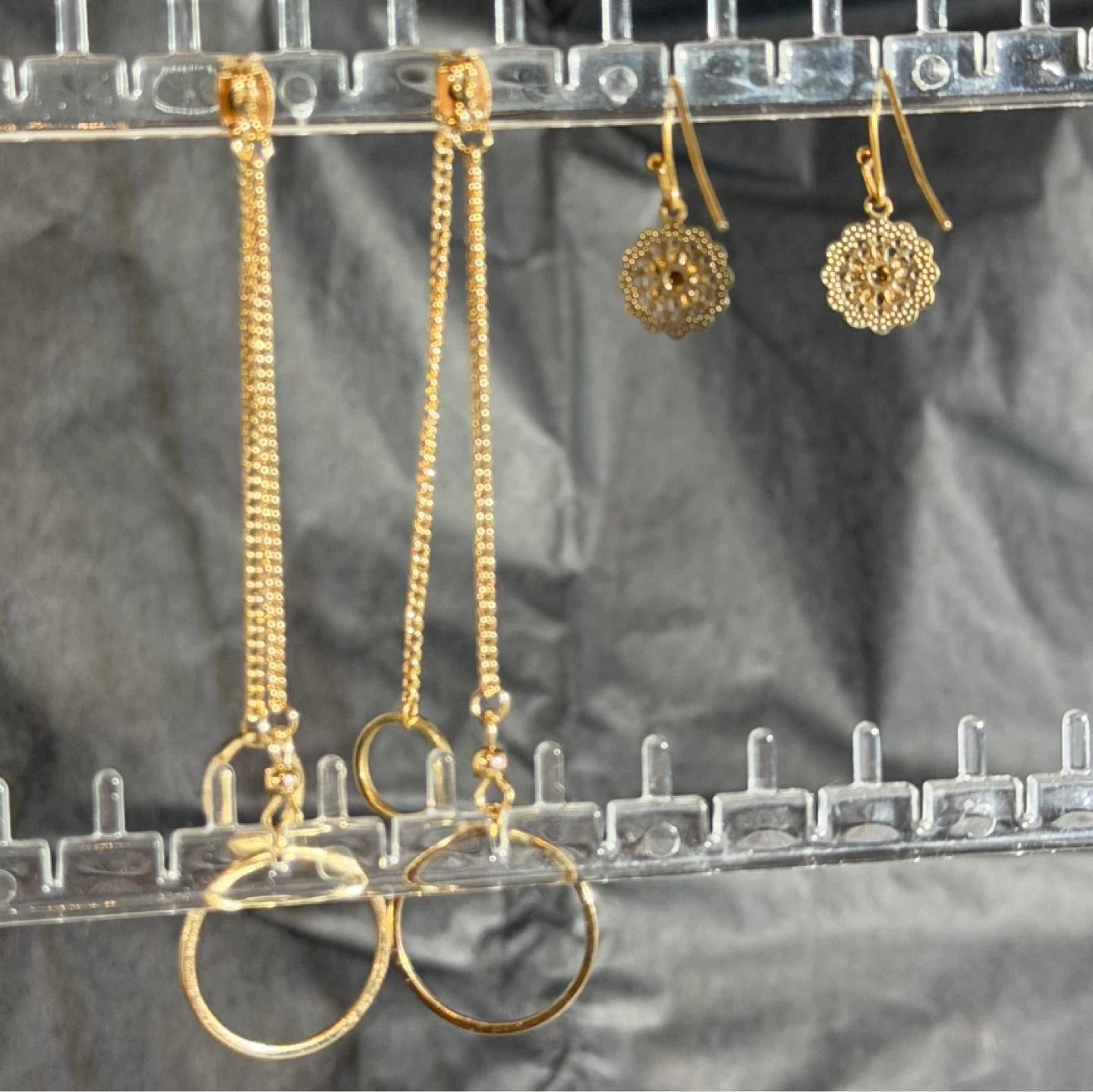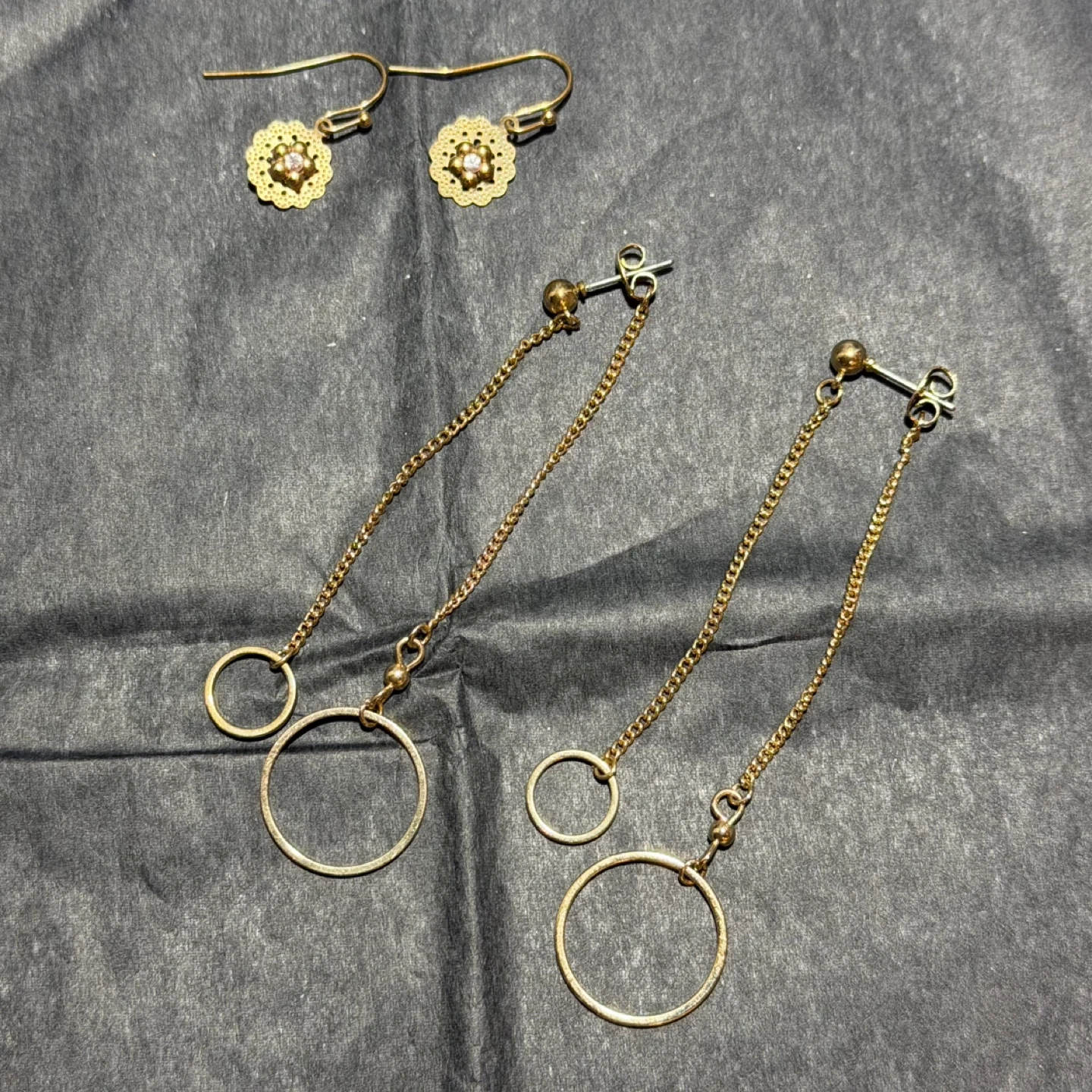 65Selling a set of two pairs of earrings. One pair is a gold flower design, and the other is a gold chain with a ring design. They are in great condition!