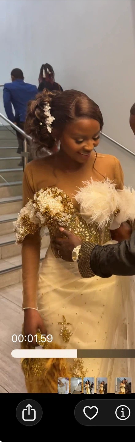 10Description: Turn heads in this stunning custom-made gold and cream gown, designed with intricate hand-beaded details, shimmering sequins, and a sheer neckline. The soft tulle overlay and gold embellishments create a rich, regal look — perfect for weddings, engagements, or cultural celebrations. • Size: Small • Condition: Worn once, professionally cleaned • Features: Beaded bodice, gold accents, sheer sleeves, elegant drape • Fit: Slim at the top with a graceful flowy skirt